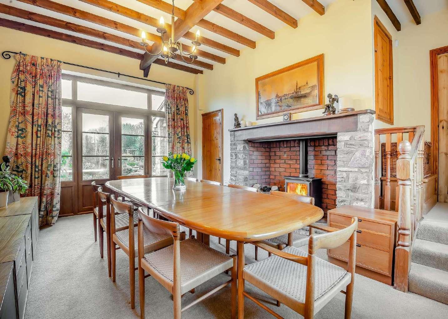 Doors from both the sitting room and utility, open into a bright dining space with a feature fireplace and inset log burner, as well as exposed beams and further wooden French doors leading out to the rear patio terrace.