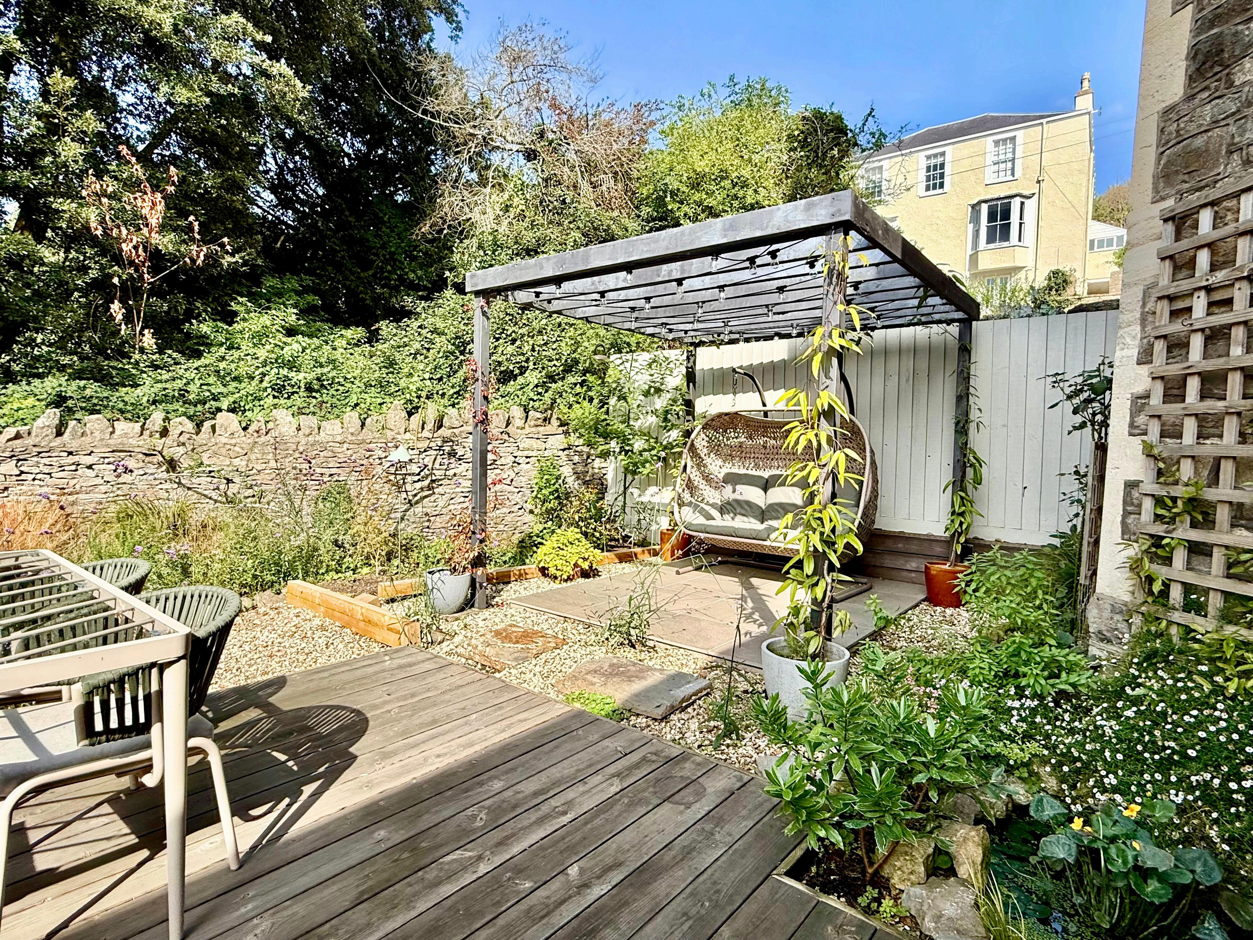 The rear garden, extending to approximately 80' feet, is mainly laid to lawn with mature borders, trees, and shrubs offering privacy and tranquility. The paved patio and bespoke two-level decked terrace provide the ideal setting for dining or evening drinks while enjoying the stunning Channel views and sunsets. The garden also includes several storage sheds, a woodstore, and access to a peaceful woodland area beyond ideal for nature lovers and pet owners alike. To the front of the property there is a well-stocked garden together with off street parking and useful side access.