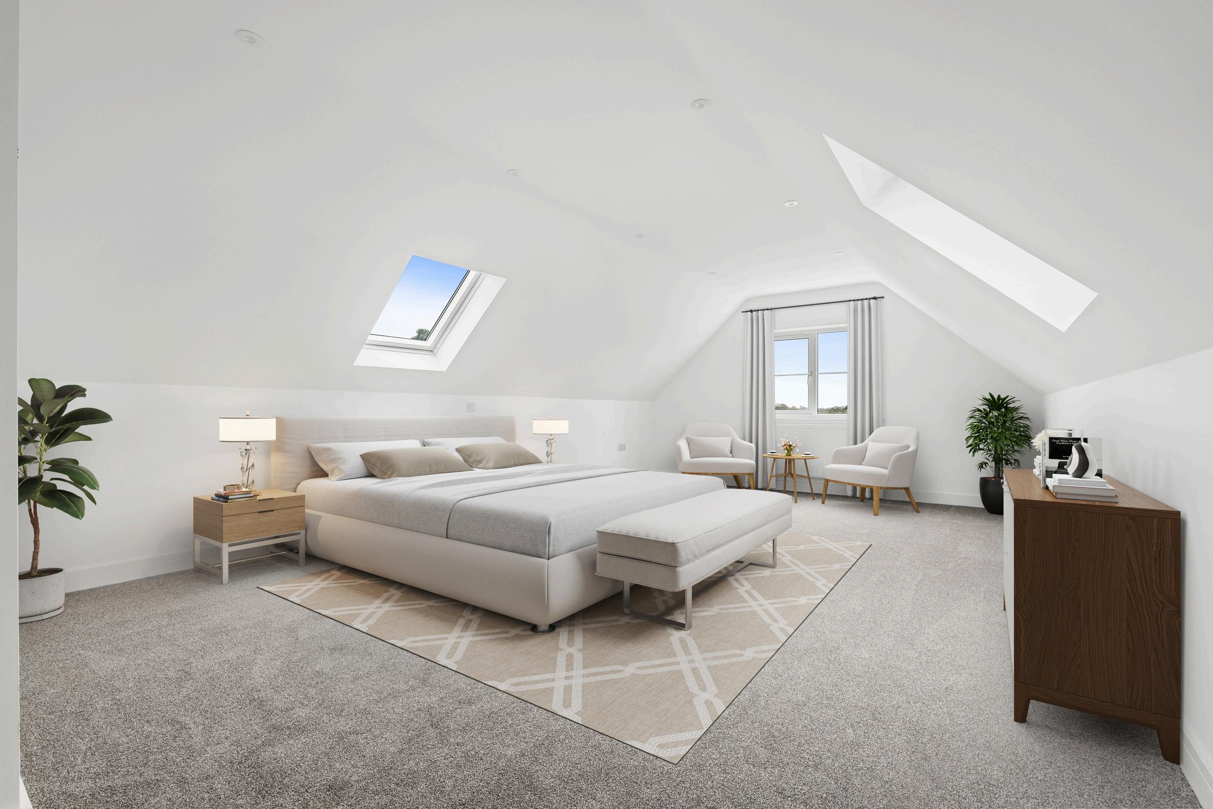 The principal suite occupies the entire second floor, a tranquil retreat beneath the eaves, featuring a spacious layout with ample room for a king-size bed, living area, storage, and a luxurious en suite bathroom. Large skylights fill the room with natural light, creating an airy and serene atmosphere.