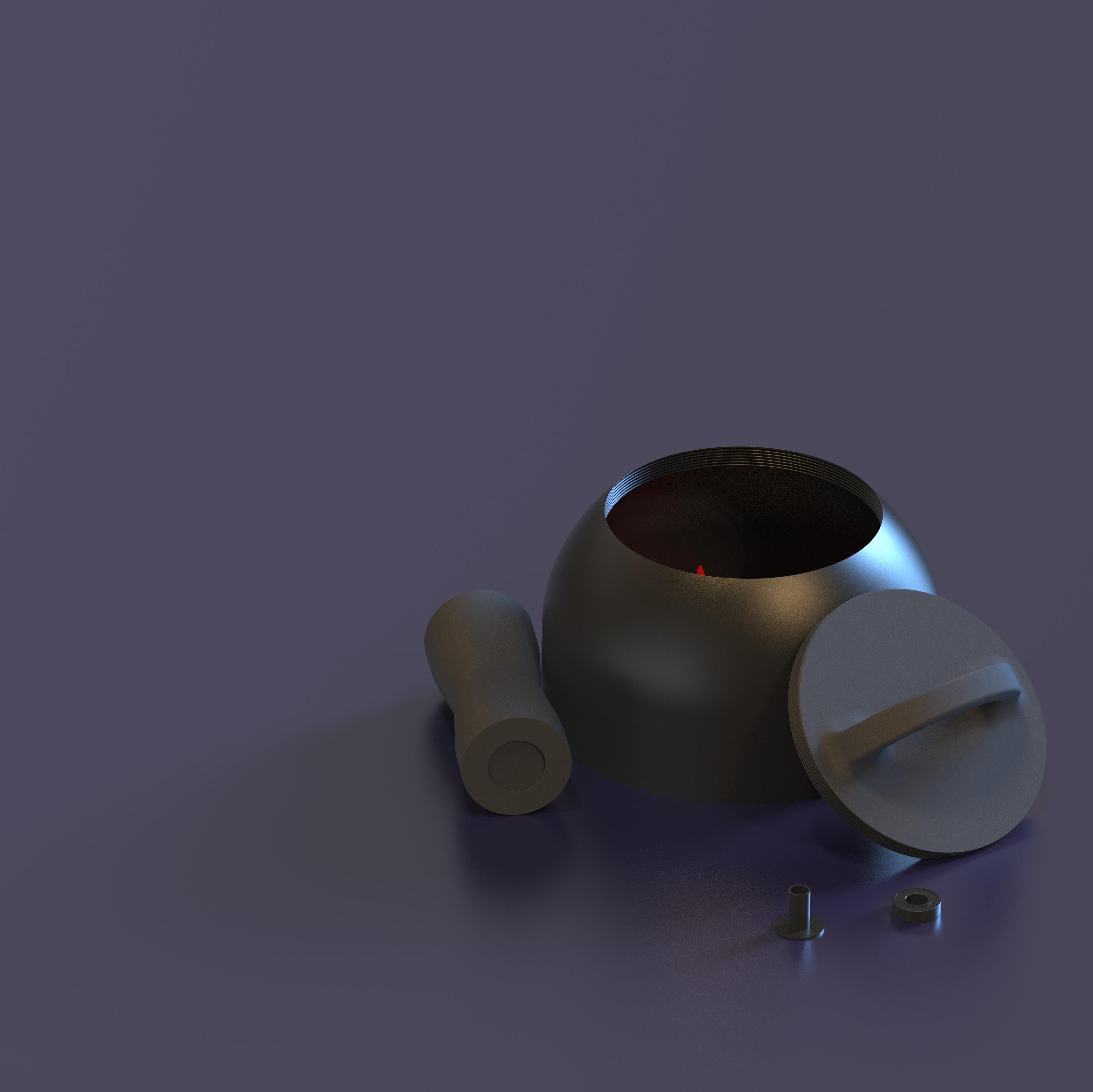 Assembly Components 01 / ABS body + Lid 02 / Rubber O-Ring 03 / ABS handle 04 / Aluminium ball bearing Primary Manufacturing Method Blow Moulding Dimensions Length / 300mm Capsule Volume / 120mm Handle width / 60mm 01 03 04 02