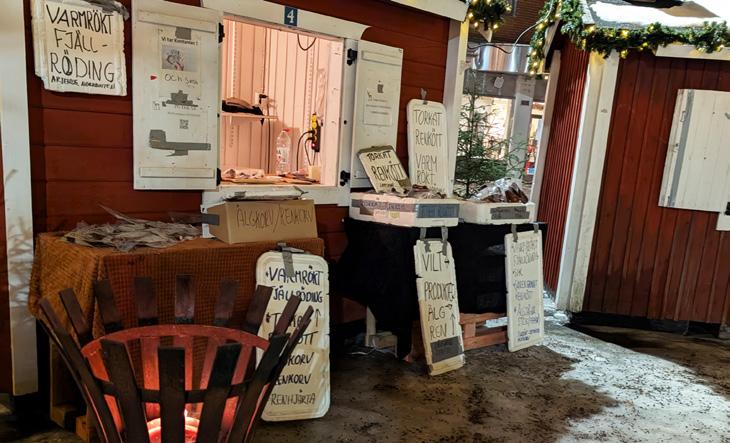 Sätt dig ner på en bänk med renfällar mellan de röda försäljningsstugorna med en kopp varm glögg, träffa tomten eller klappa några renar.