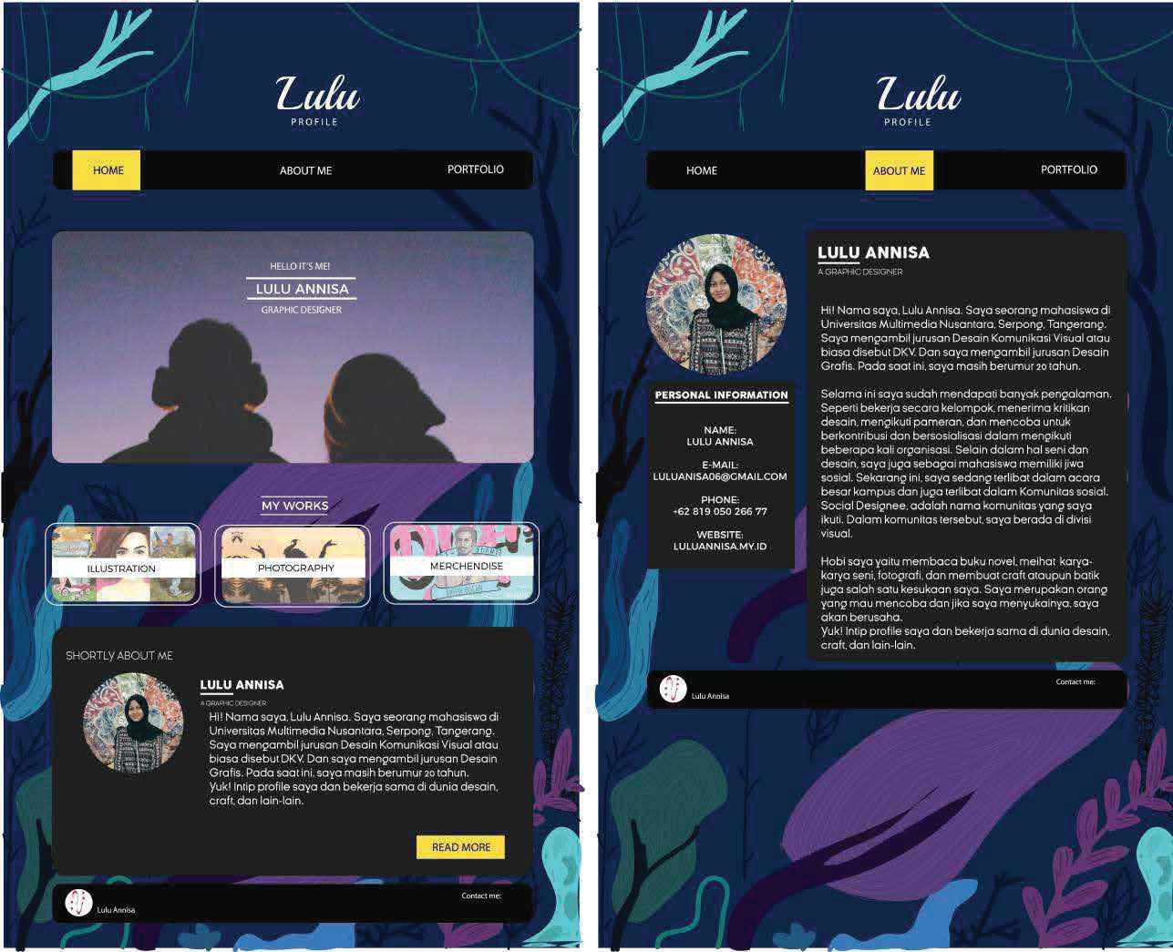 Hi! Hi! I’m Lulu, a creative person and senior graphic designer who curious and want to know more about something new. I like to explore a new trend and create a new creation. I loved to have a new-good social environment. Happy and enjoy to work as a team and also individually. Furthermore, i can work well under pressure and always do my best. I believe i could potray my passion through my work(s). Lulu +62 877 8422 3754 @luluanns luluanisa06@gmail.com Let’s catch up! Let’s catch up! https://www.linkedin.com/in/lulu-annisa/