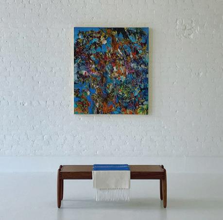 In another series, Seaweaving, recently exhibited at the Ventura College New Media Gallery, Bonewitz collects seaweed from local beaches, weaving it while it is still wet, and letting it dry on the loom. She then transforms the organic material into large-scale installations that will inevitably decay, the seaweed gradually changing in color, texture and weight. As in many of her paintings, these works are all about the shadows, the strands of seaweed casting their own hues and shapes along the walls. They are also about time, the collection and manipulation of the materials existing in contrast to their natural state.