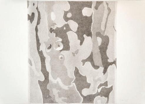 Her subtle graphite drawings, hung far of the wall in the Taf Gardens studio as if they were foating, cast shadows like transparent headstones.