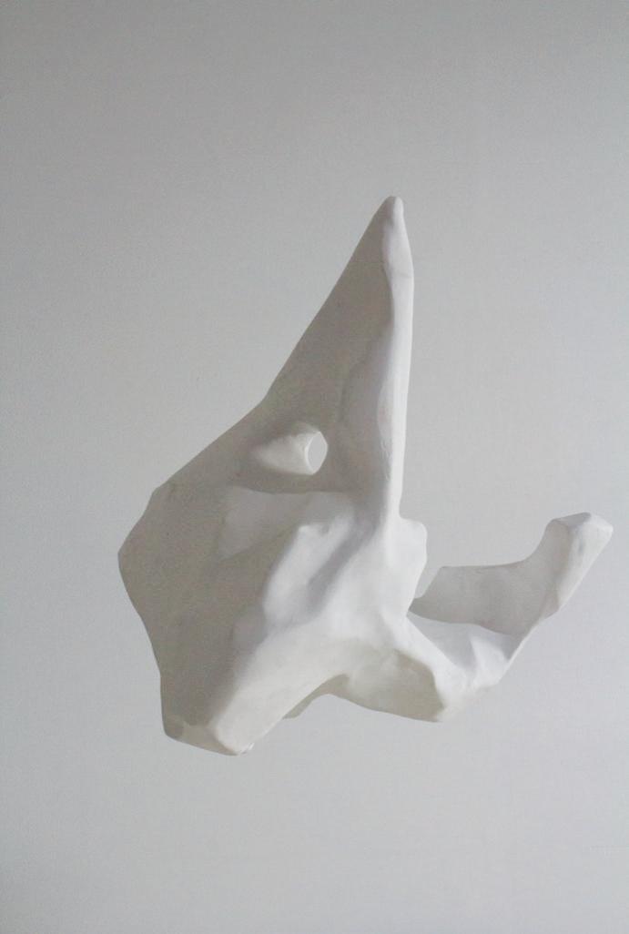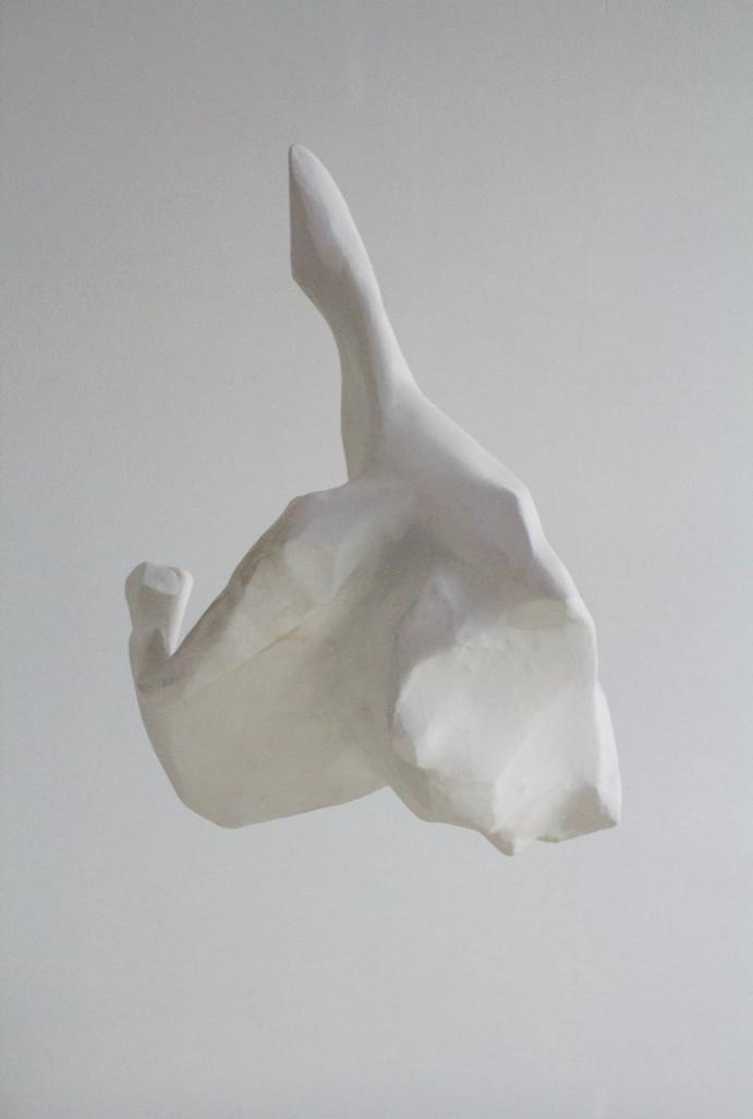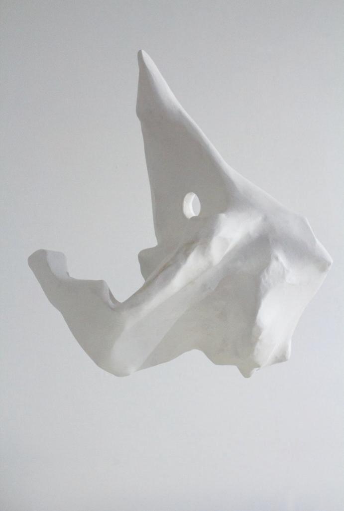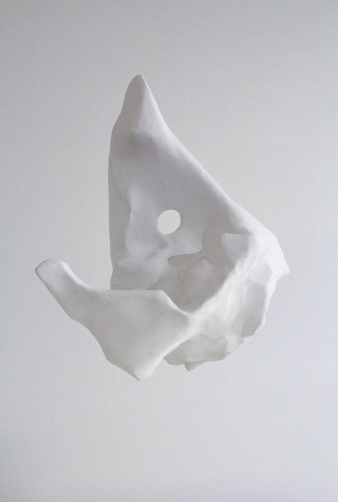 In many ways, this balance between transience and permanence defines Bonewitz’s practice, both in the subject matter she chooses and the materials she works with. Her white papier-mâché and plaster sculptures – the abstract shapes themselves referencing specific architectural details, her own body or personal mementos – look like bones or fossils. They give the