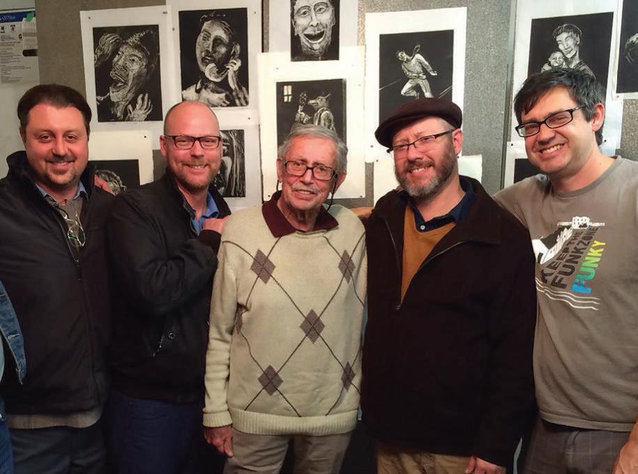 Counterclockwise from top lef: Untitled, detail, Tom Schultz; Matthew Straka, Abandoned Van; Michael E. Long, Eclectica (diorama); Gary Chafe, Making a Monotype; Knights of the Rondo (from lef) Tom Schultz, Matt Straka, Gary Chafe, Michael Long and Ethan Turpin; Ethan Turpin, Feedback Ripples