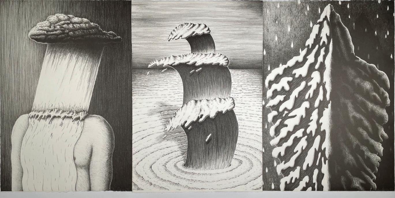 Each feels like a living memorial, animated by sublime grief and asserting their presence as both drawings and sculptures. They are viscerally afecting and quietly alive, and they demand a moment of repose and slowness to contemplate them. The greyscale of her skyscapes allows them to be any sky, anywhere, and to occupy an abstract conceptual space. But that lack of color also recalls the disturbing orange that was present in the Ojai sky.