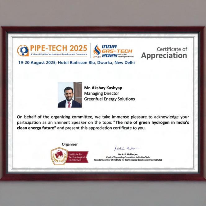 Mr Akshay Kashyap, Managing Director - Greenfuel recently presented at the India Gas Tech Conference 2025, highlighting the pivotal role of Green Hydrogen in reshaping India’s energy landscape.