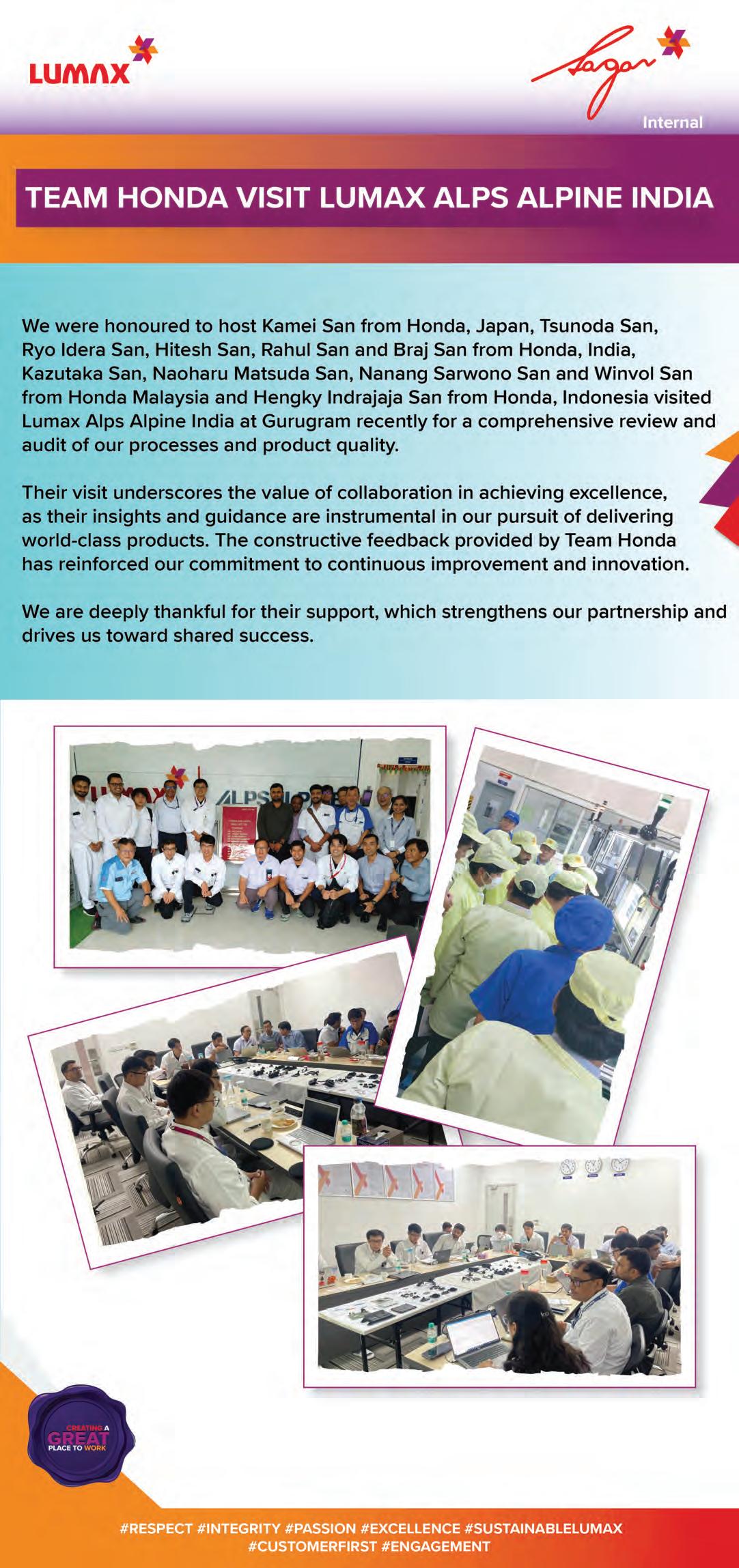 In August 2024, Lumax Industries Limited - Electronics Division hosted the Senior Management Team from Honda Motorcycle and Scooter India led by Mr Sanjeev Jain, Mr Yuichi Akita, Mr Kamal Garg, Mr Anurag Kalra, Mr Vikas Kapoor, Mr Sunil Ojha, and Ms Lalita.