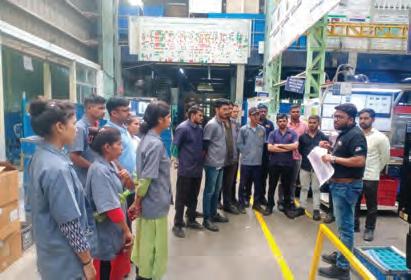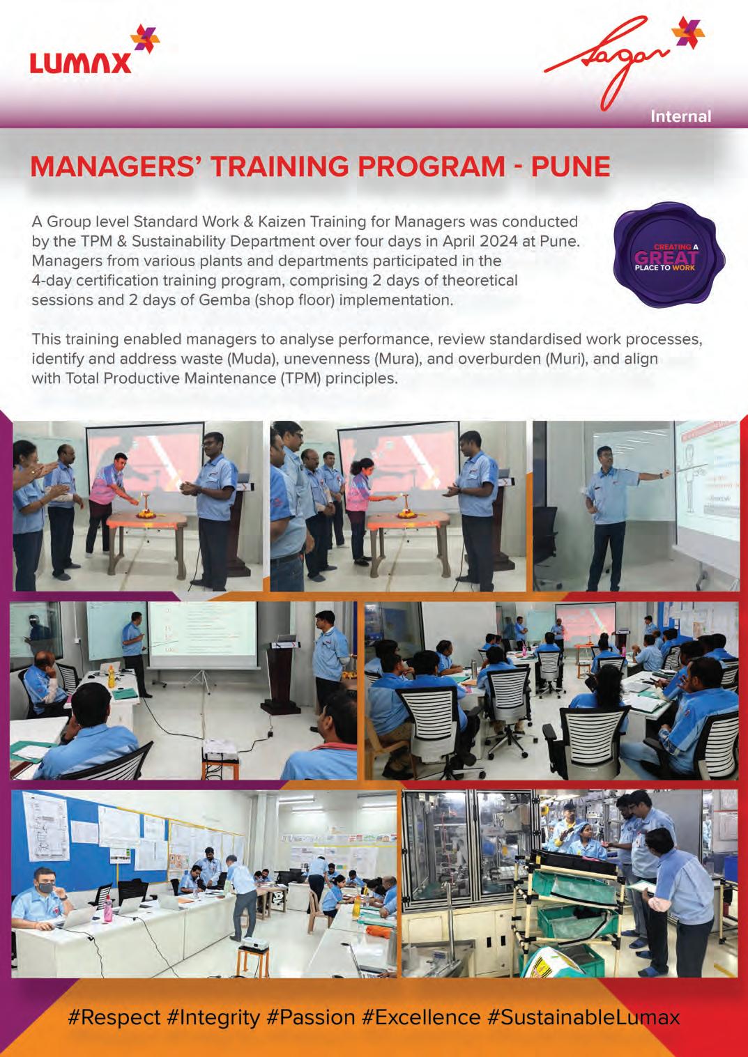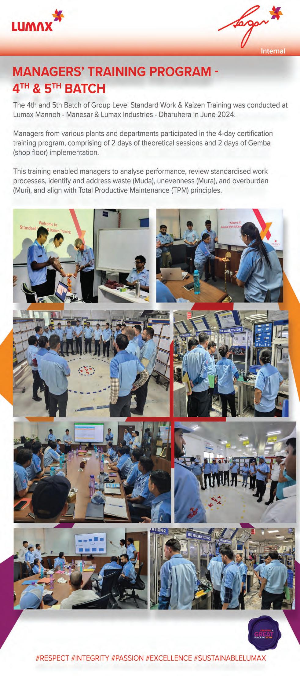 empowering managers to analyse performance, review standardised work processes, and identify and address waste (Muda), unevenness (Mura), and overburden (Muri). This training also emphasised alignment with Total Productive Maintenance (TPM) and Sustainability principles. The comprehensive 4-day certification program included 2 days of theoretical sessions followed by 2 days of Gemba (shop floor) implementation.