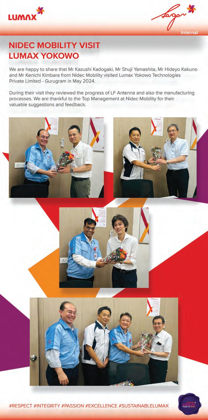 In May and June 2024, Top Management from Nidec Mobility team visited Lumax Industries - Electronics Division in Bawal and Lumax Yokowo in Gurugram. The visit included Mr Kazushi Kadogaki, Vice President - Production Division, Mr Shuji Yamashita, Manager - Power Electronics & Body System Business Division, Mr Hideyo Kakuno, Chief Manager - Strategy Planning Group, and Mr Kenichi Kimbara. The team reviewed our LF Antenna manufacturing processes at Lumax Yokowo, the Electronics manufacturing processes at Lumax IndustriesElectronics Division and provided invaluable feedback. We are thankful to Nidec Mobility’s top management for their suggestions, which will help us refine our processes and continue delivering high-quality products.