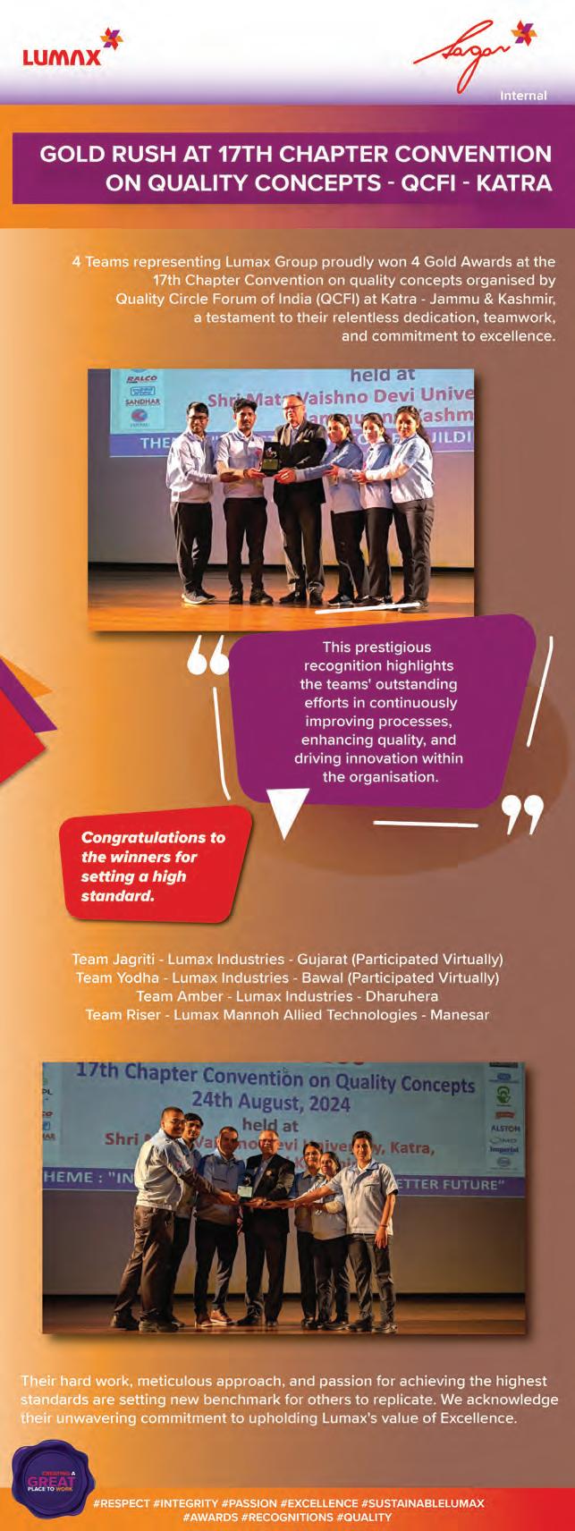 Teams from the Lumax Industries—Dharuhera plant won two Gold awards and one Silver award at the 18th Chapter Convention on Quality Concepts organised by QCFI. With this year's theme, 'Investing in People, Building a Better Future,' our teams showcased innovation, commitment, and excellence.