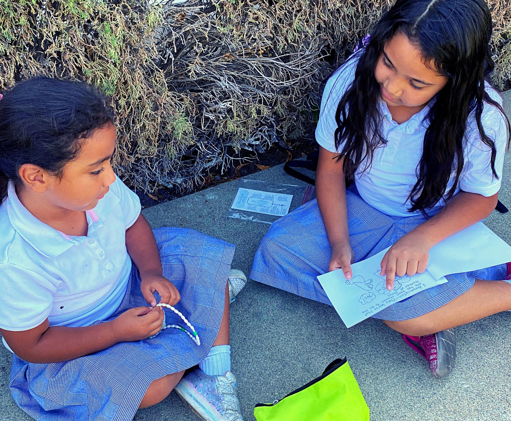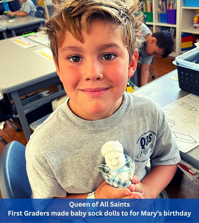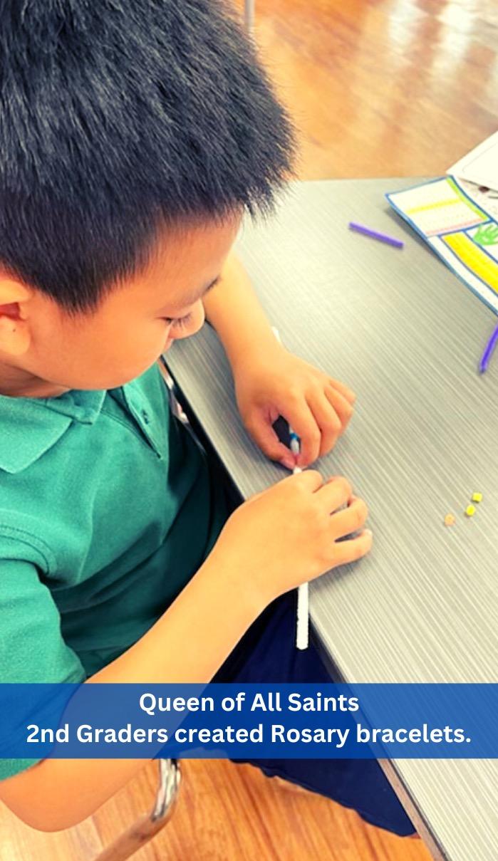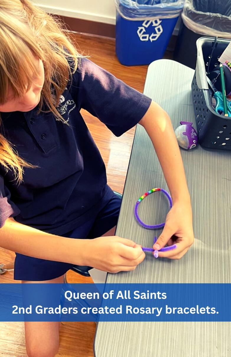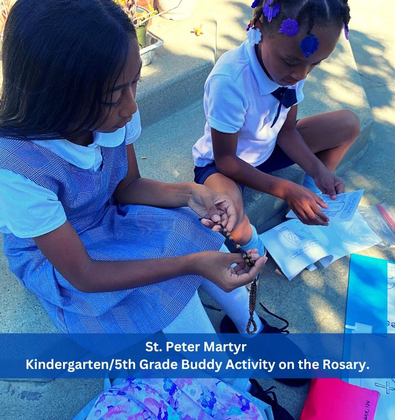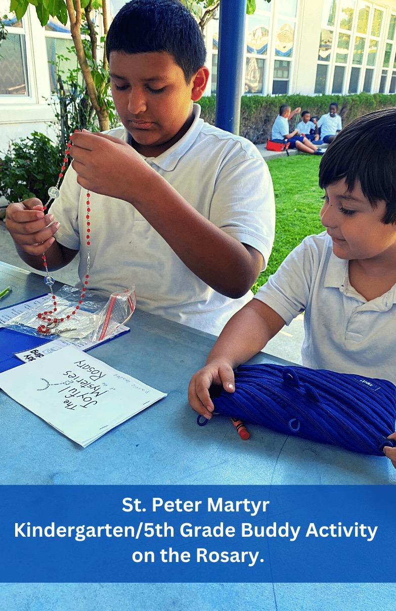 In September, the 1st graders at Queen of All Saints celebrated Mary’s birthday by making baby Mary sock dolls and students at St. Catherine of Siena gathered in Faith Families to make Rosary bracelets, the 2nd graders at Queen of All Saints created bracelets as well, for themselves and as gifts for family members and special friends. The students have also spent time praying the Rosary together in class. Throughout the month of October, we honor our Holy Mother, Mary, in thanksgiving for the protection that she gives the Church in answer to the praying of the rosary. The Kindergarten and 5th Grade Reading Buddies at St. Peter Martyr learned about the joys and the mysteries of the Rosary on the Feast of Our Lady of the Rosary.