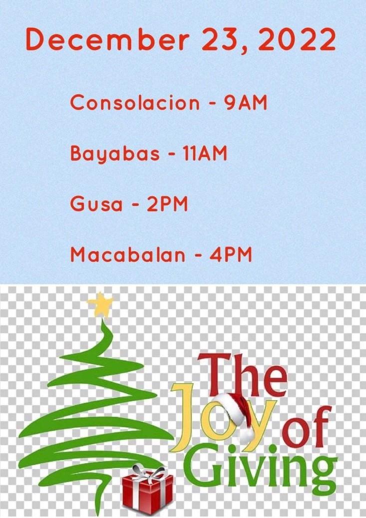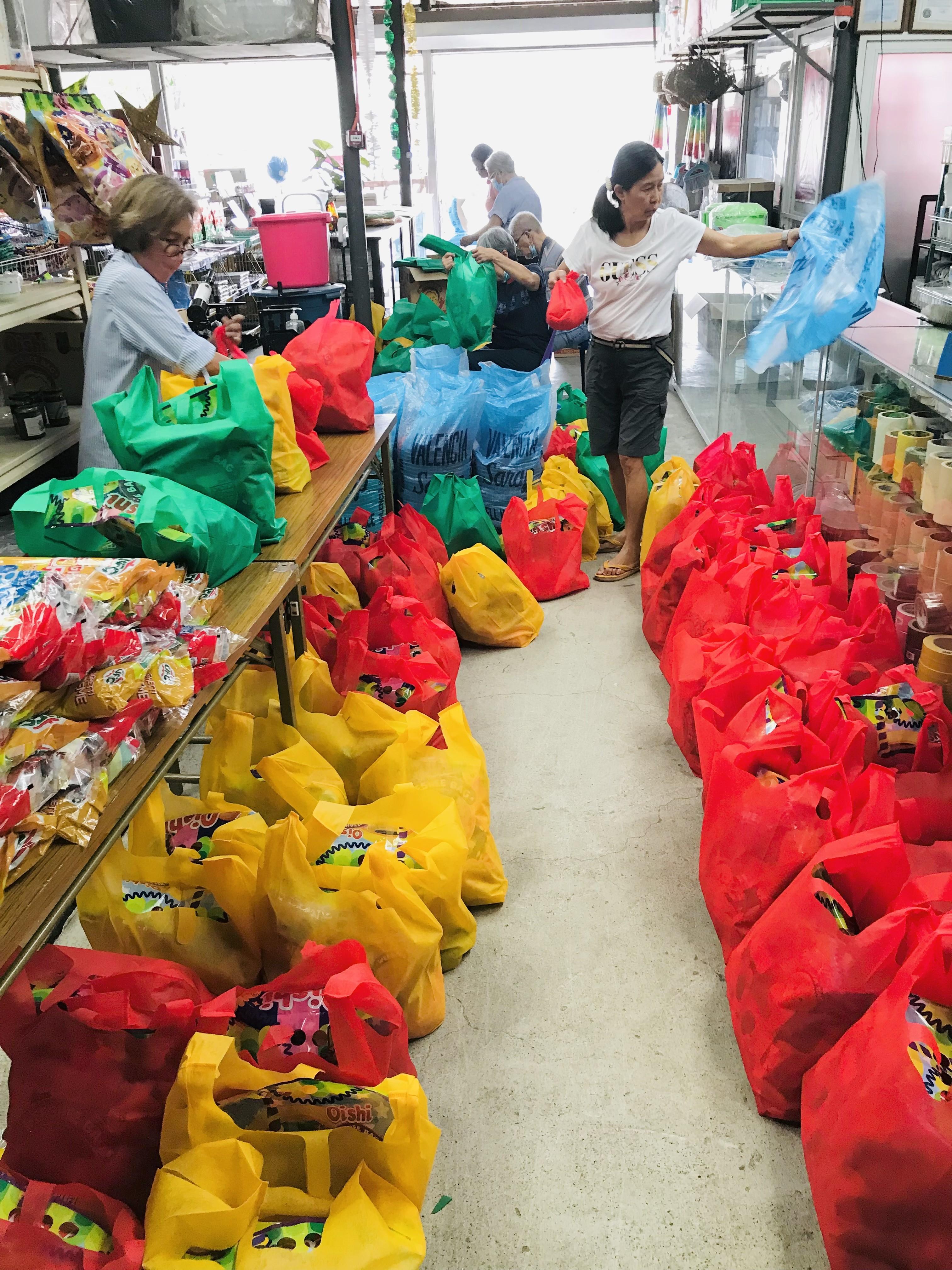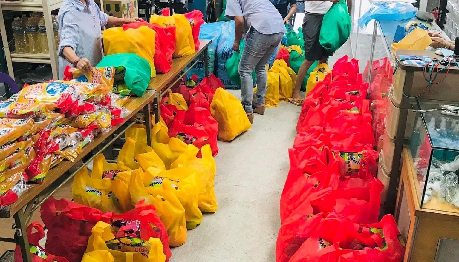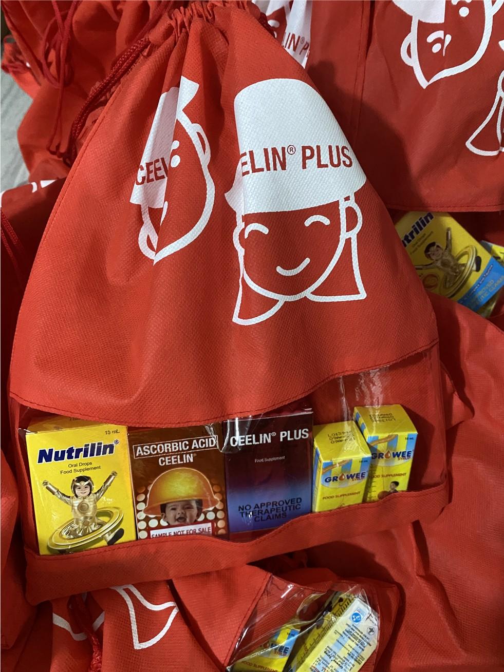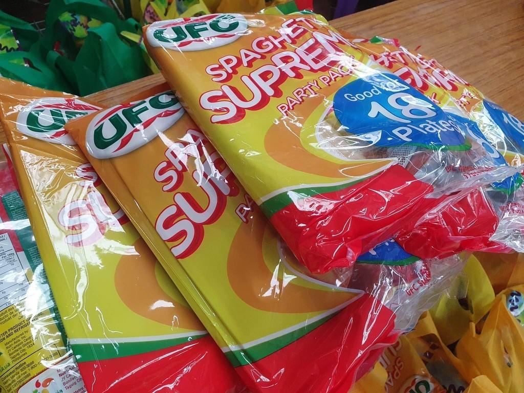The Noche Buena Bag contained the basic spaghetti pack of pasta, sauce and cheese. It had a large loaf of bread, three kilos of rice, beverages in sachets of three-inone coffee and Milo chocolate drink. Oishi chips and biscuits were included for the kids. Loot bags of vitamins from Unilab were also included in the bag. A total of 222 Noche Buena bags were prepared.