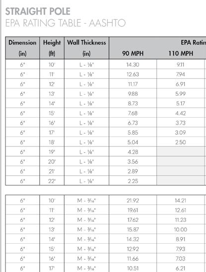Correlate each pole’s dimensions (height, material, shape, and thickness) with the acceptable EPA accordingly to the AASHTO Wind Map.