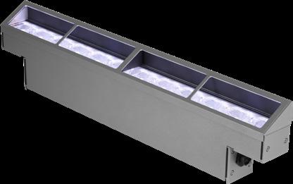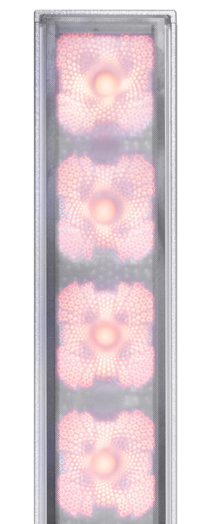 L'éclairage lèche-mur, dit « wallwash », utilise un éclairage vertical indirect, placé à une distance et un angle optimaux par rapport à un mur, pour créer un effet doux et uniforme. L'éclairage wallwash est souvent utilisé pour masquer les imperfections grossières, éliminer les ombres et éclairer un mur uniformément. Le Lumenfacade Max possède l'optique nécessaire pour créer un effet propre et impressionnant sur un grand nombre de surfaces et de hauteurs de surface.