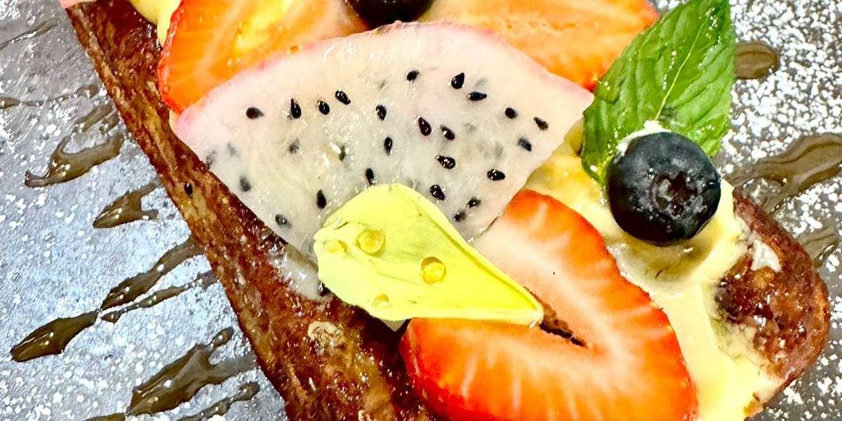 Pochadosservidossobrepanfrancésyucateco,concochinitapibil,salsaholandesade naranjaagriayaceitederecadorojo.