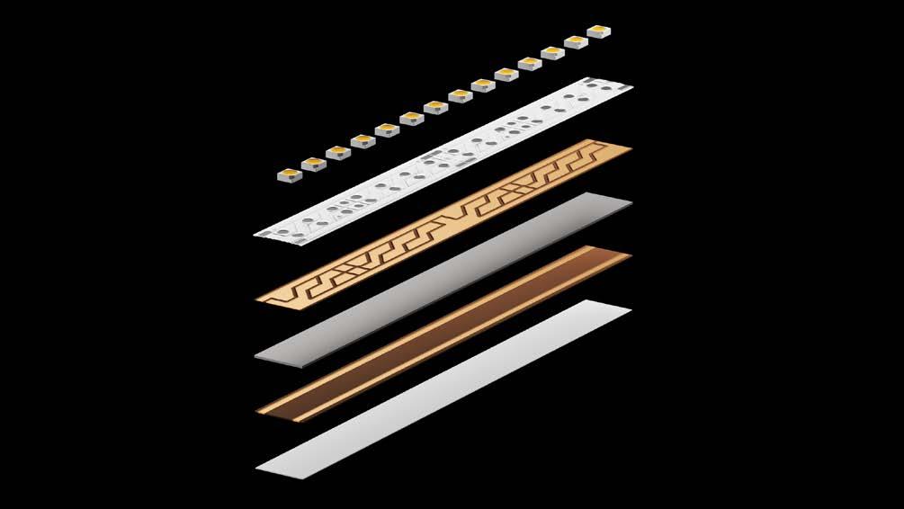 Luminii’s linear LED strips are engineered for high performance and reliability through a combination of dual-layer PCB design and robust material selection. Each board uses 3–4 oz. copper with optimized front and back trace geometry to improve thermal dissipation, minimize voltage drop, and maintain consistent lumen output. Solder pads support 18AWG wire and are compatible with Luminii minii con nectors for durable, field-friendly connections. The strip uses 3M VHB thermally conductive adhesive for secure bonding and efficient heat transfer, and it is mechanically reinforced to resist pulling and twisting during installation.consistency.
