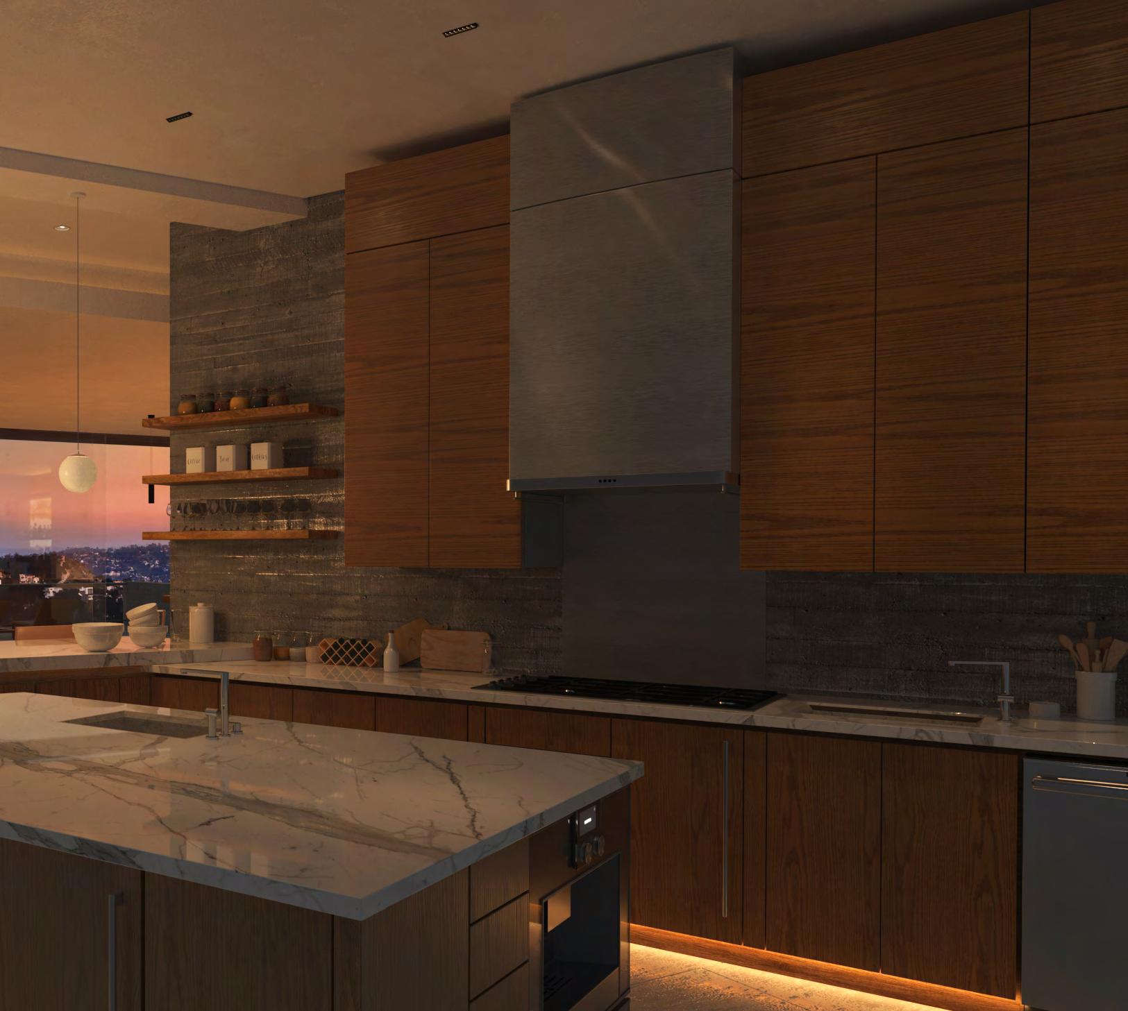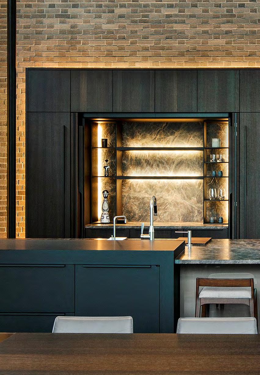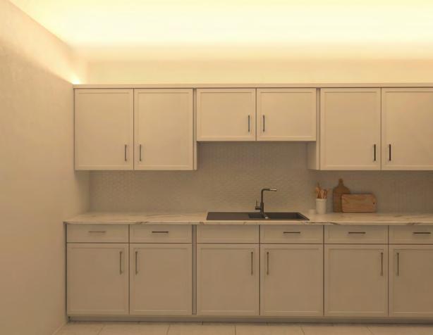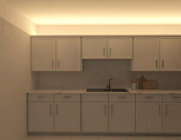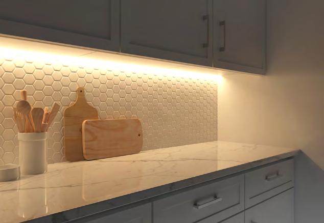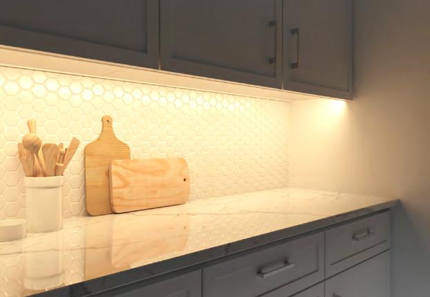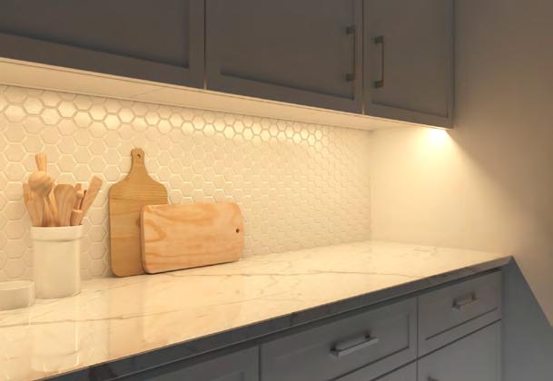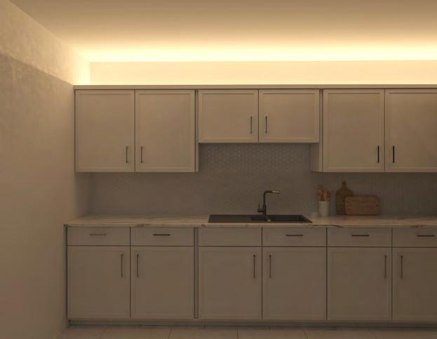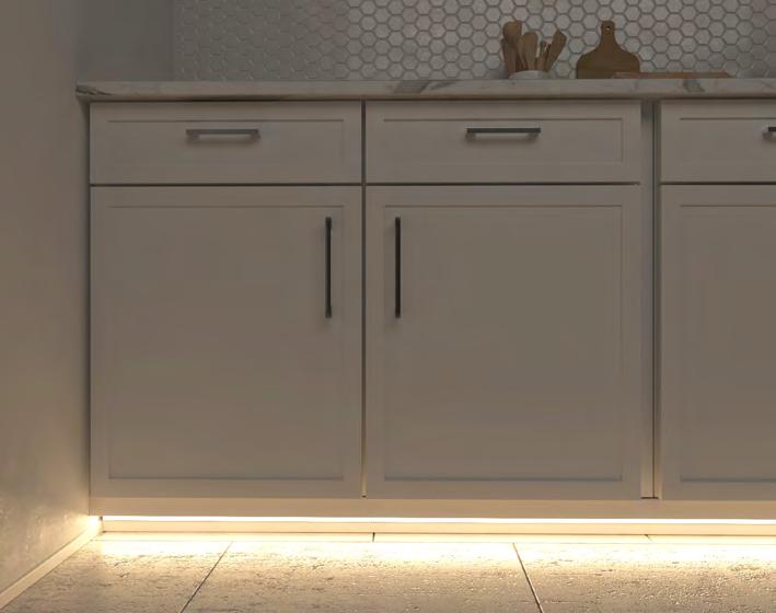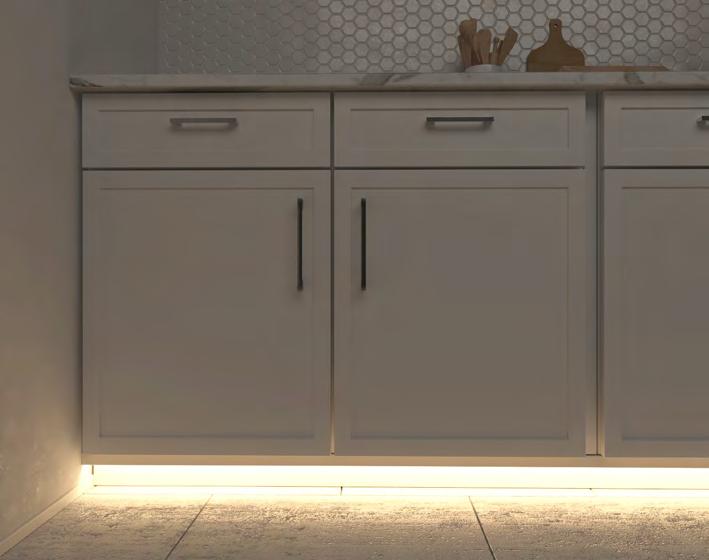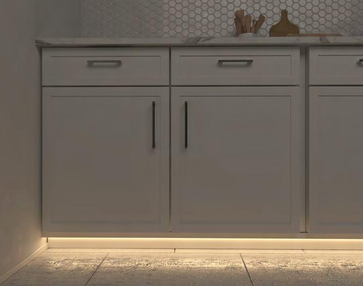Toe-kick lighting adds a sleek, modern touch to kitchens while providing practical, low-level illumination. For a crisp, defined look, direct toe-kicks create clean lines of light along base cabinets. Looking for something softer? Indirect toe-kicks reduce glare on polished floors and subtly highlight millwork or cabinetry details. For added visual interest, grazing toe-kicks can accent tex tures on materials like stone or wood, enhancing depth without overwhelming the space. We recommend Luminii’s Kendo S Sur face Static White or Tunable White, available in damp or wet-rated versions, with an optional graze lens for a more dramatic effect.