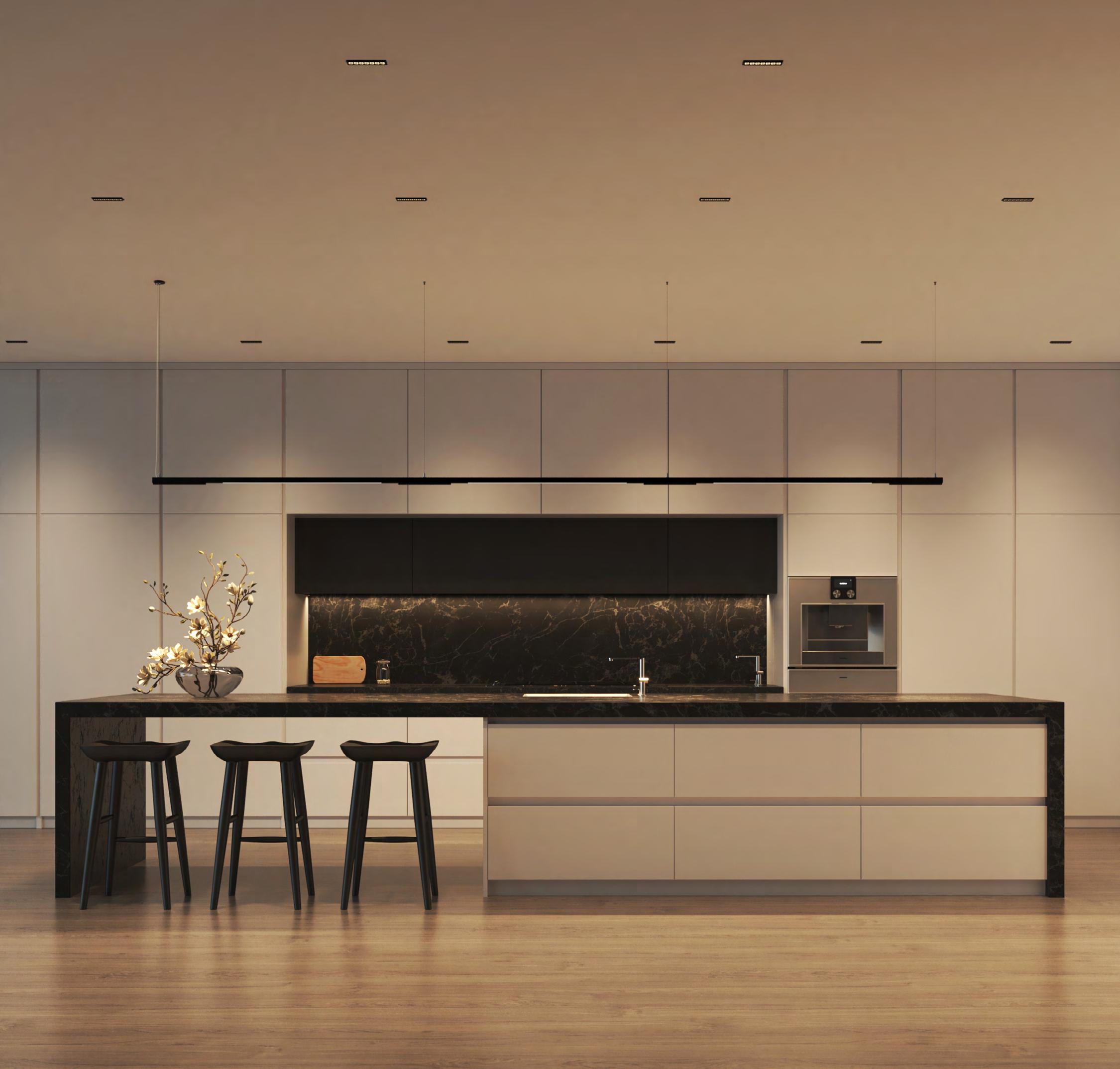 As the central hub of activity, the kitchen island demands lighting that’s both functional and visually refined. From food prep to casual dining, the right lighting elevates the entire kitchen experience. Whether your design leans toward downlighting, suspended fixtures, directional accents, or ambient glows—Luminii has a solution. For a clean, modern look, we recommend the barely-there Stenos micro-optics downlight range, offering seamless, low-profile illumination. For greater flexibility, the Stenos micro-optics Suspended Track system includes directional and ambient options, plus track heads for targeted light. With infinite track shapes and lengths, Stenos adapts beautifully to any kitchen layout.
