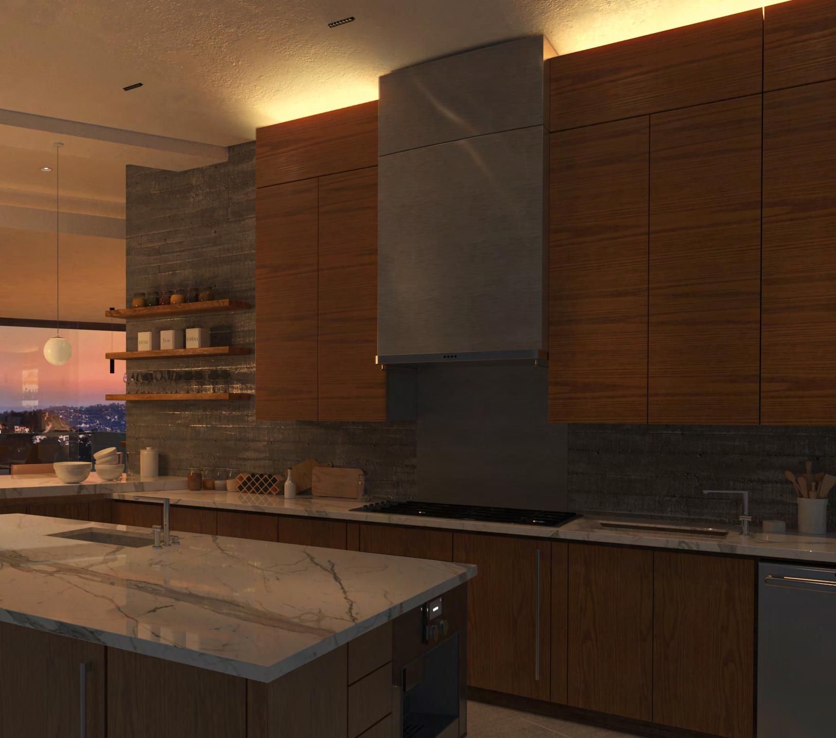 Add depth, scale, and warmth to kitchen spaces with thoughtful over-cabinet and cove lighting. In traditional applications, low-level cove simulation can support or even replace downlighting—ideal for kitchens with exposed ceilings or limited overhead space. In rooms with tall ceilings, over-cabinet lighting draws the eye upward, washing the ceiling and enhancing the sense of scale. For forward-throw accent lighting, we recommend Luminii’s Kendo 45M Static White with frosted lens (available in damp or wet-rated versions). For soft, indirect accents, Kendo M with frosted lens is ideal, while Luminii’s mCove Surface Mount in Static White or Tunable White offers high-output general illumination.