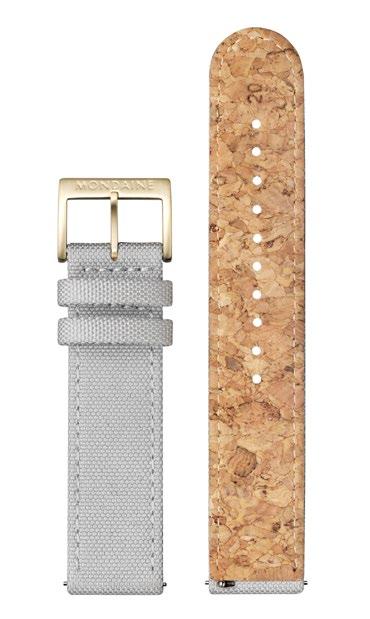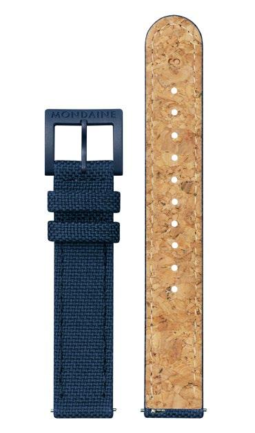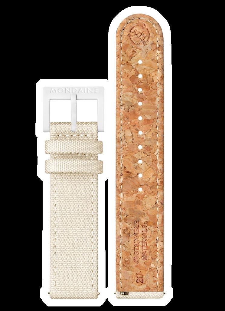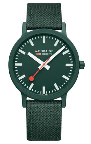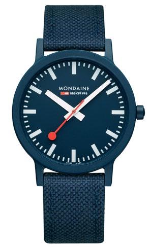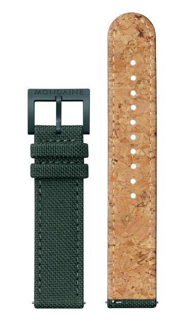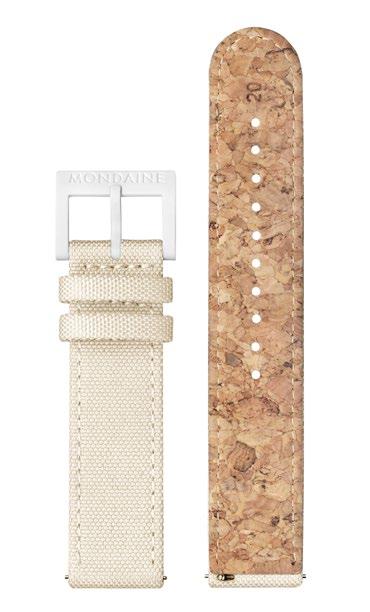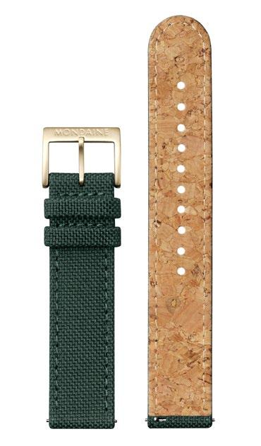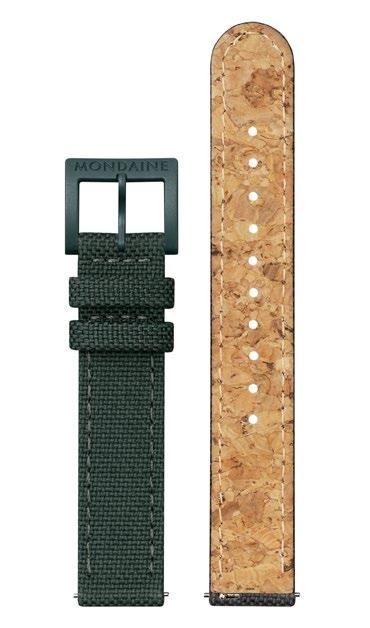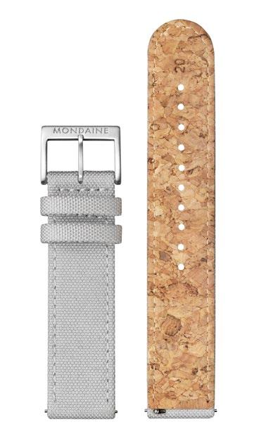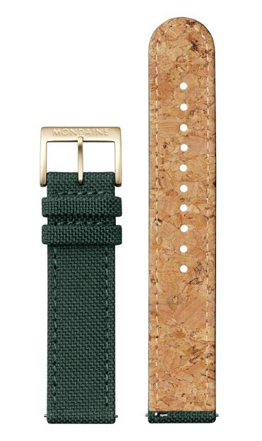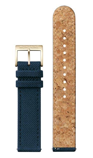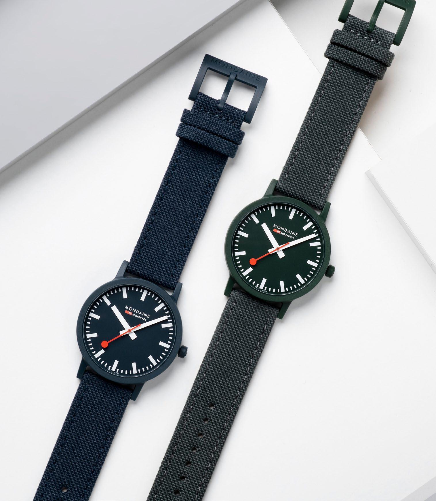 MONDAINE honors the anniversary of the Swiss Railway clock. essence collection was updated with 100% vegan eco-friendly strap made from cork lining and textile from recycled PET bottles, with a quick-change enhancement. 2019
