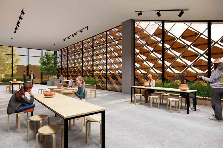 The youth center’s Morning bunch is the only cafe and serves free, healthy meals to its guests. There are numerous places to sit at the cafe. One such spot is outside, where you can take in views of the live artwork workshop area, the timber facade, and the entrance made of stained glass with Aboriginal designs.