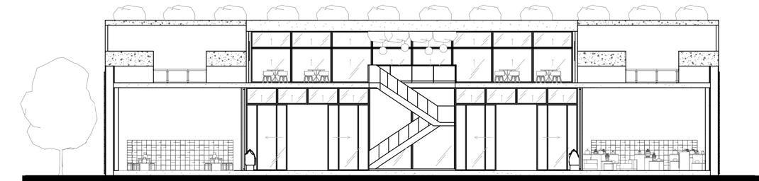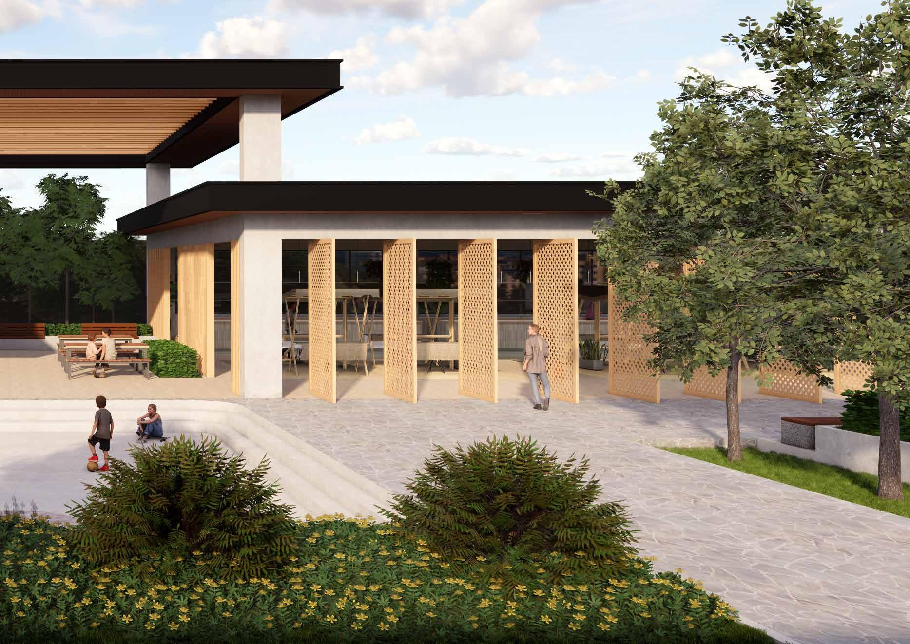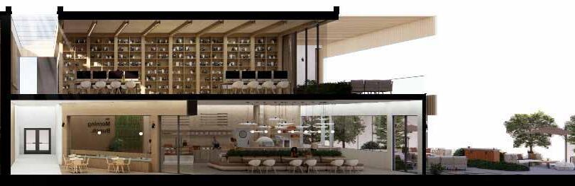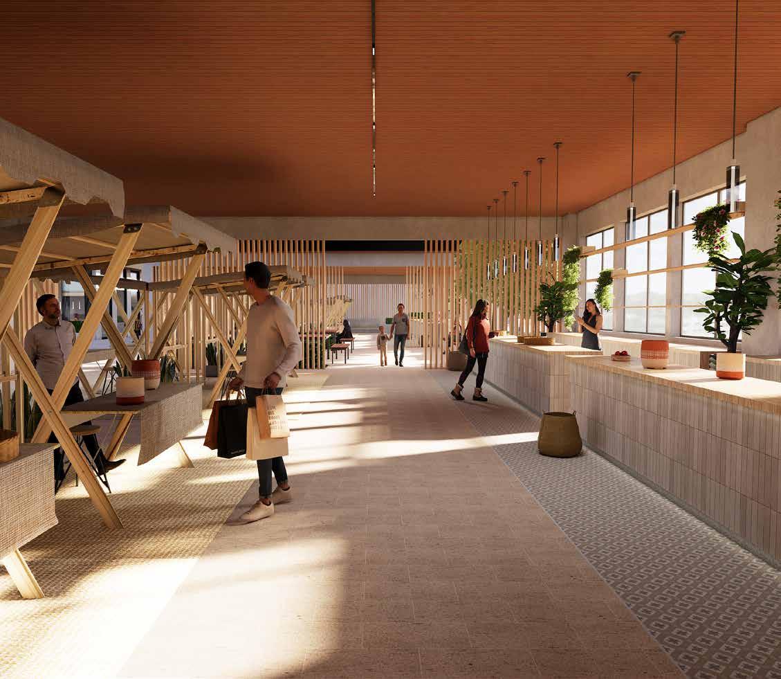 The community market has two wings that are created by dividing the markets. The food market is on the left, and the community market is on the right. Connecting the markets is a foyer that links to the courtyard.