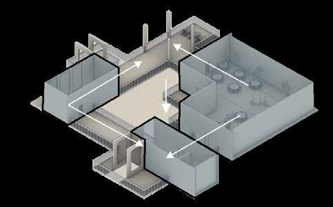 The hallways’ open layout eliminates obstacles and sharp turns to create a roomy, easy-to-navigate path for guests.