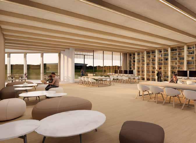 The classroom features large windows that allow natural light to flood the space, creating a warm atmosphere that highlights the earthy tones of the reclaimed wood ceiling and raw concrete walls, enhancing the connection to nature. Additionally, flexible, modular furniture made from recycled materials further emphasise the commitment to sustainability.