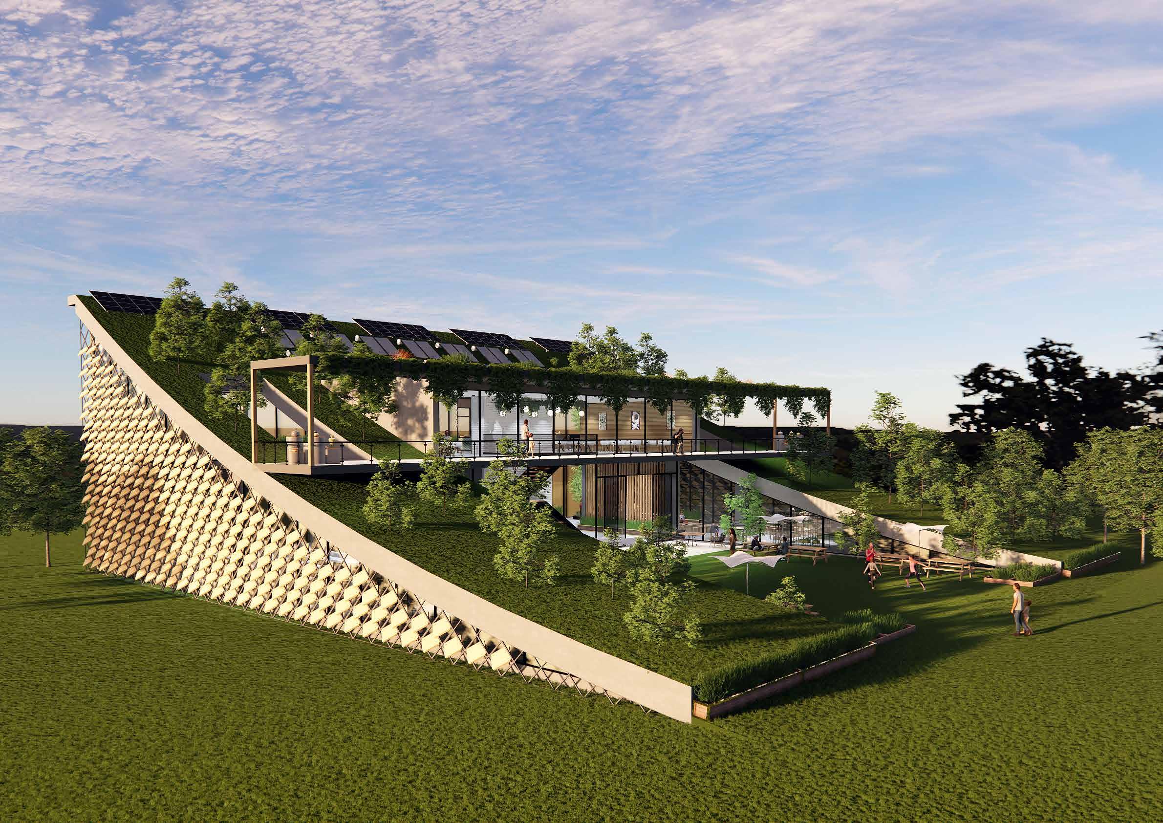 The project demonstrates a dedication to sustainability by utilising passive heating and cooling systems throughout, a planted roof covering a concrete sloped frame, and eco-friendly materials like recycled wood for furniture. The structure exemplifies an innovative and environmentally conscious approach to architectural design.