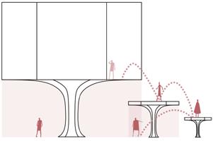 Adding floors above the ground helps build up the vertical space. Gradually setting back floor boundaries promote visual communication.