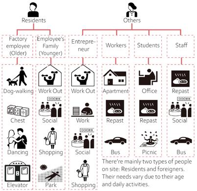 Axonmatric&Timeline Buy Breakfast In Community Store Have Dinner In The Community Work In Design Studio Have Lunch Work Out In Gym Work Out In Gym Set Exhibition In The Gallery Wake Up In The Hotel Walk Around Visit The Design Studio Community Center Visit The Art Gallery Visit The High-rise Back Home Have Lunch Chat And Walk Back Home Do Exercise Pick Up Grandson At School Han-Worker In The Art Studios Meng-Original Resident Guo-Tourist Drawing by Jinyue Han