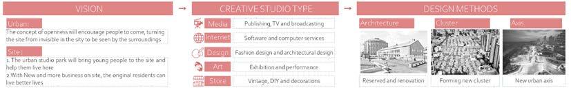 The site originally has little connection to the city. Therefore, even though the site is surrounded by parks, TOD, education resources, and commercial squares, only a few people visit this area on purpose. Only employees that used to work in factories remain here, making the site lack creativity and vitality. With all combined, the site is nearly invisible in the surroundings and the city . To help the site be seen, several approaches are used to achieve the goal. The original existing architecture is evaluated and few are removed to create clearer axes through the site. Three axes for different uses and themes are created. Factory buildings are transformed into studios that welcome both tourists and young people to start their businesses here, hoping to make the site attractive again.