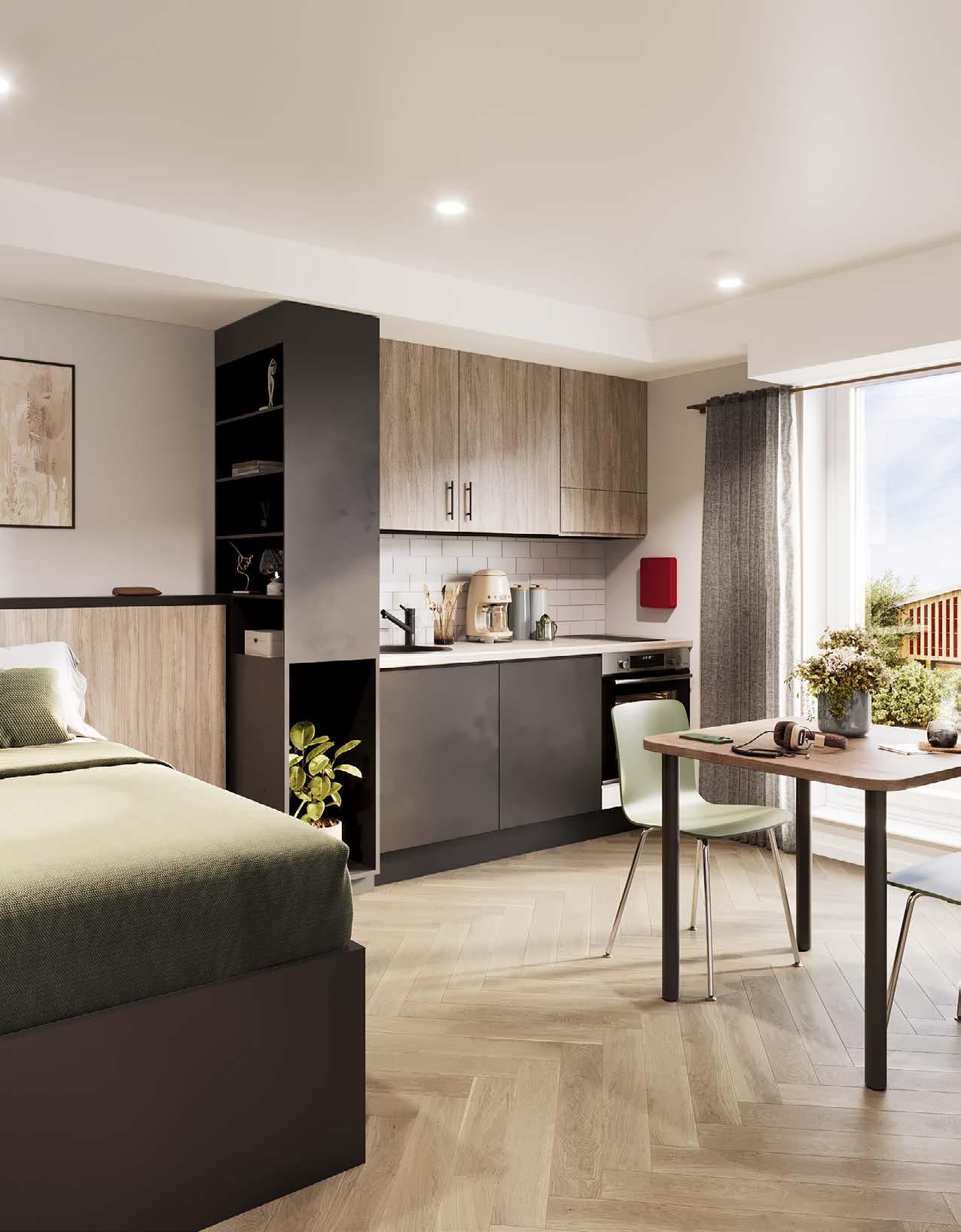 Each studio features a comfortable double bed, a generous wardrobe, and a dedicated study area, making it easy to stay organised and focused. The fully equipped kitchenette, including a combimicrowave oven, is perfect for preparing meals, while your private en-suite bathroom adds a layer of comfort and privacy.