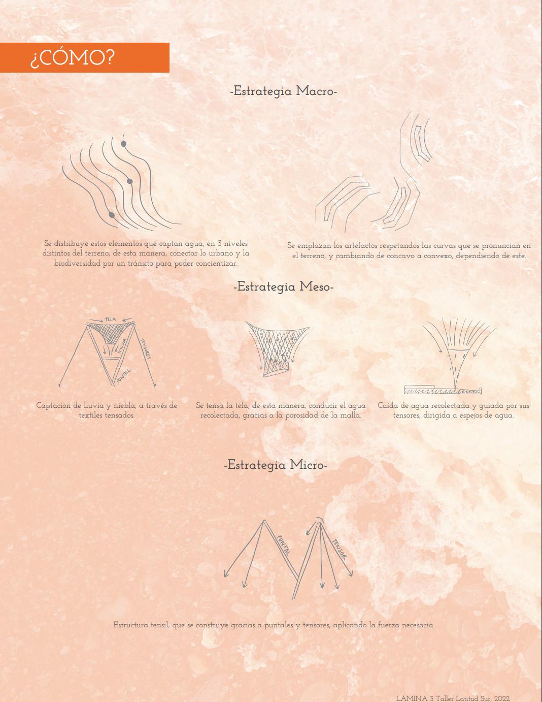 Desarrollo de artefacto para recolectar agua de lluvia y neblina en la ladera del río Gamboa, en respuesta a la crisis hídrica en Chiloé debido a la sobreexplotación del pompón. Esta situación ha dejado a Chiloé sin un proceso de deshielo adecuado, diferente al resto del continente. Nuestra solución involucra estrategias de construcción sostenible en madera y tensoestructuras, creando un corredor recolector que también sirve como herramienta educativa para concientizar sobre la extracción irresponsable de este musgo vital para el ecosistema local.
