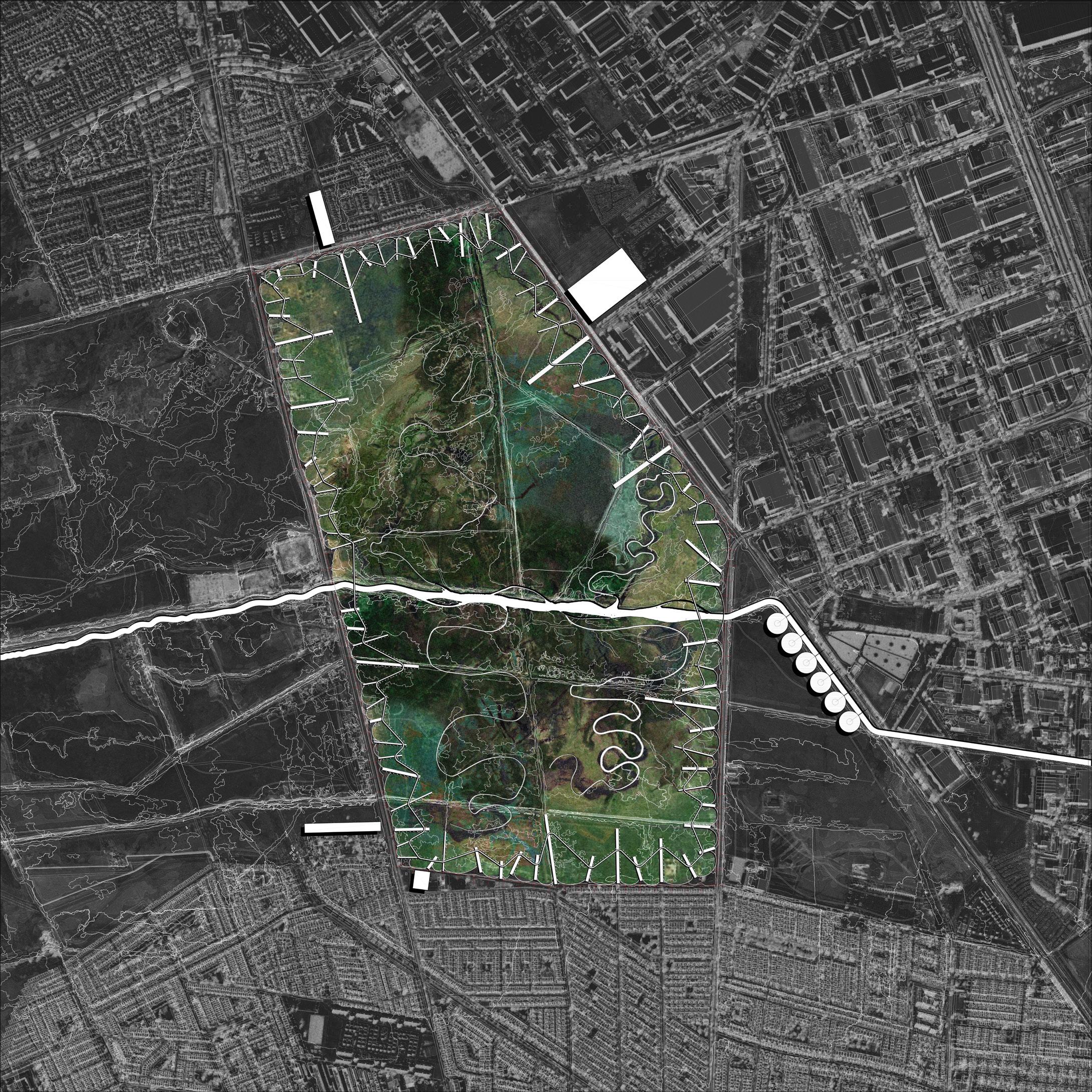 El proyecto propone transformar el sistema de refrigeración de los Data Centers en un ciclo incorporado al humedal para abordar la interrupción del ciclo del agua. Se cuestiona la delimitación actual del humedal, alejándola de la propiedad privada y redefiniendo un límite como barrera contra el desarrollo inmobiliario, protegiendo la biodiversidad. Artefactos tecnológicos actúan como límite, acumulando datos y creando espacios de conexión con el humedal. Funcionan como procesadores y almacenadores, con sensores de extracción de agua para concientizar sobre el ciclo hídrico, con un sistema de refrigeración geotérmica, dentro del mismo ciclo. Además, implementan programas en el borde urbano, como senderos y nebulizadores, para preservar el ecosistema del humedal. El nuevo límite atrae a diversos actores, incluyendo comunidades, empresas como Google (que busca recuperar el 120% del agua consumida) y la biodiversidad nativa.