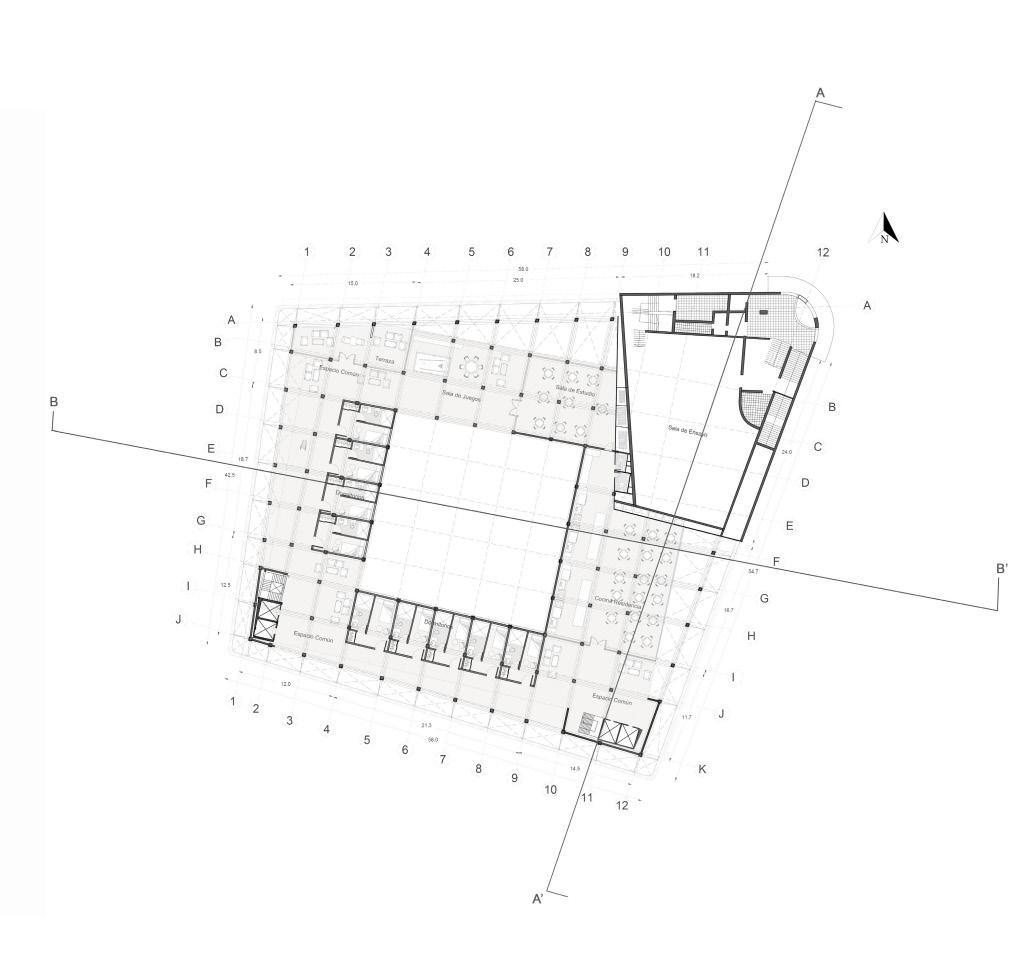 La extensión se posiciona en la cúspide del teatro, respetando la fachada del edificio patrimonial y añadiendo valor sin interrupciones visuales. La organización de la extensión se rige por una grilla interna cuadrada que se va abriendo gradualmente. Los ángulos más irregulares de la orientación de la fachada son atendidos por los núcleos verticales, tomando como referencia la estética del edificio Nest We Grow diseñado por Kengo Kuma. Este enfoque estructural aporta cohesión y un toque contemporáneo a la extensión del Teatro Manuel Rodríguez.