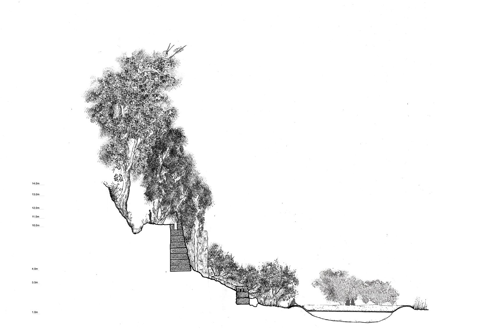 La premisa de revitalizar la vegetación seca y otorgar valor al agua se materializa a través de un muro fragmentado que desencadena una serie de actos, gestos y sensaciones. Este muro, diseñado para redirigir el flujo del agua del canal, establece una interacción única entre el cuerpo del agua y el cuerpo humano.
