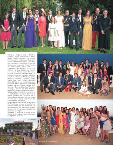 Fadrique e Iñigo Álvarez de Toledo y Eusebio, Javier, Concepción y María Jesús Valdés Moreiras, sus primas Beatriz Vicente-Mazariegos Álvarez de Toledo y Ana López Valdés, y sus amigos Santiago Domínguez Cano de Santayana, Macarena Pérez Ramos, Ana Sastre y Elena García Ocón. Testigos del novio: Su padre Valentín Martínez Cordón, sus hermanos Ángel María, Juan Enrique, Cristina y Myriam Martínez Allué, su hermano político Ignacio Sánchez Agustí, sus tíos Juan Enrique y Carlos Martínez Cordón, y Emilio, Ángel María, Juan José y María Mercedes Allué Gómez, y sus amigos Francisco Redondo Baos, Francisco SánchezPolanco, Ignacio Poveda Salinas, Juan Carnicero Gómez, Juan José Sánchez Jáuregui, Carlos de San Antonio Gómez y Santiago Larrauri Escudero. Celebración: Finalizada la ceremonia se trasladaron a la Capilla del Rosalar, donde residen las religiosas de la Compañía del Salvador, para entregar el ramo de la novia a la Virgen del Colegio Máter Salvatoris. A continuación se trasladaron a la finca El Pendolero, antigua propiedad de Antonio Maura que aún conservan sus descendientes en perfecto estado, donde se ofreció una cena a todos sus familiares y amigos. Vestido: El traje de la novia es un diseño de la modista Marina Echánove. Fotografía: Click 10.