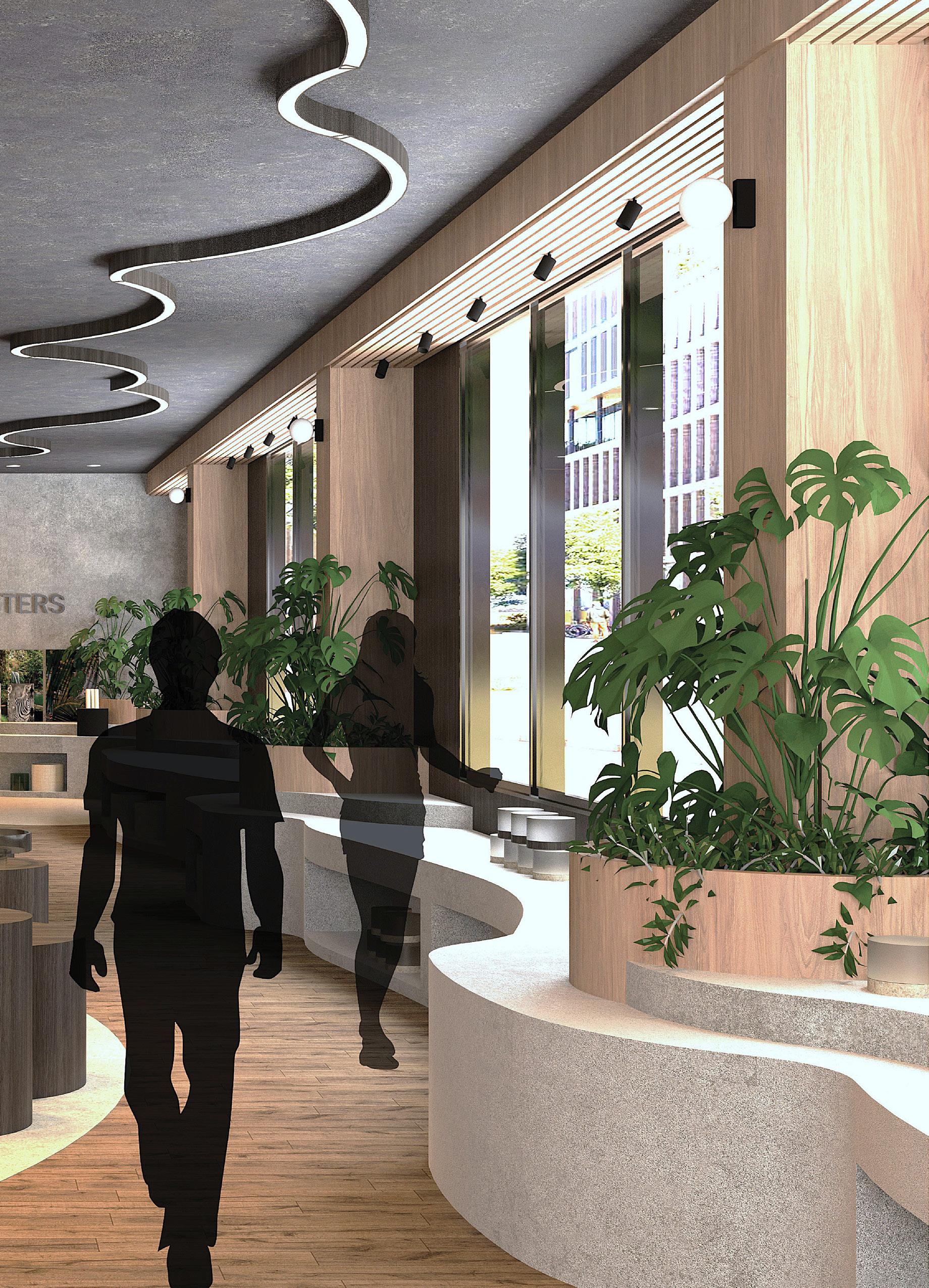 Upon entering the building, to the left, one is greeted by a reception desk sitting in-front of a glass wall where the seating area can be seen beyond. To the right, a glimpse of the store, and in the distance, a lively cafe. The reception area is a gateway to adventure, sparking intrigue and a enticing guests to explore further. Spaces seamlessly intertwine with reception with the use of organic flooring transitions in smooth curvaceous shapes.