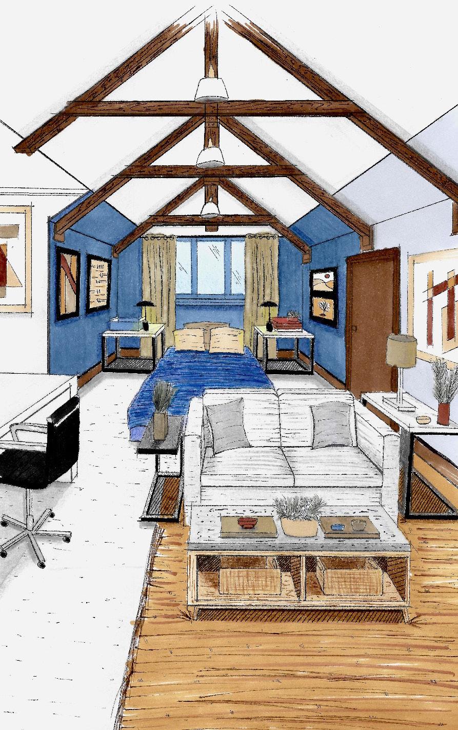Prior to starting my education, I was tasked with bringing life to an attic room. The primary goal was to minimize the visual weight of the ceiling. Low 5-foot walls created a sense of disproportion, posing a significant design challenge. I decided to paint a substantial portion of the ceiling, which creates the illusion that the walls are taller.