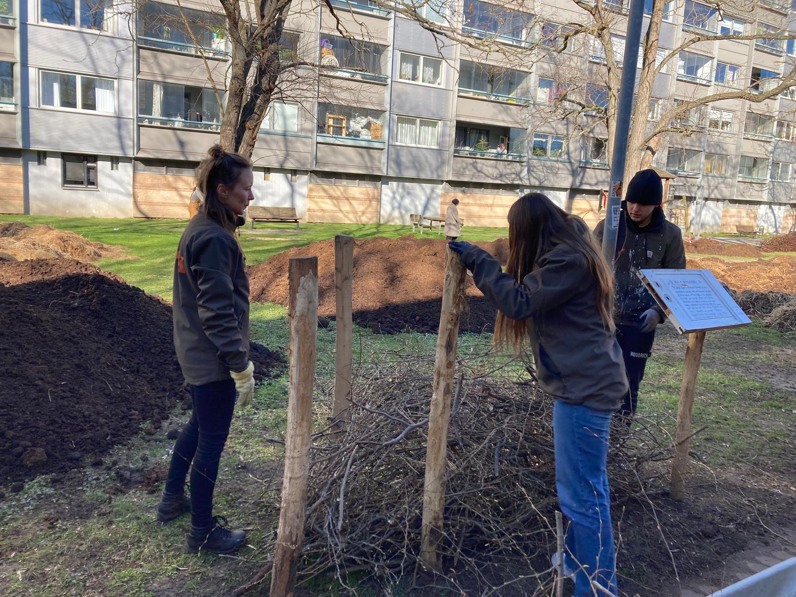 På arbejdsdagen blev der sat skilte op til haven og de første hegnspæle blev banket i, så haven fremover holdes sikker for hunde og fredelig for besøgende