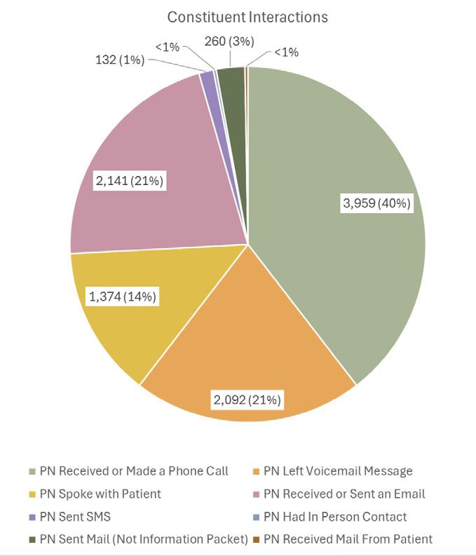 Patient navigators had 10,011 interactions. The following pie chart shows the different ways the patient navigators interacted with our constituents. We often have multiple contacts with an individual constituent, which are reflected in the totals: