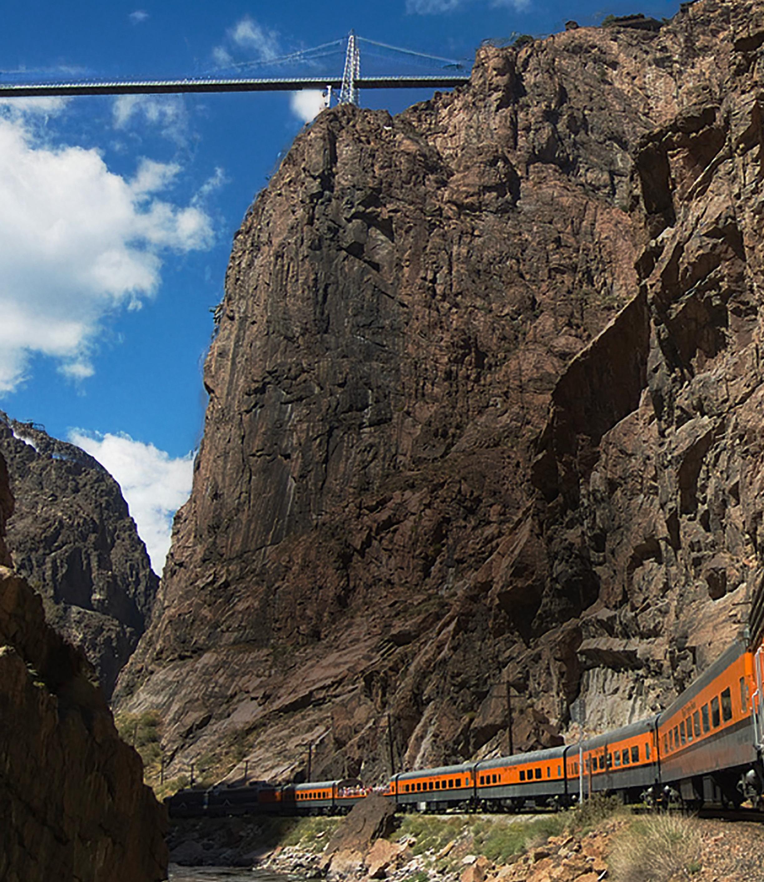 All aboard! The iconic Royal Gorge Route Railroad passes through one of the world’s most stunning canyons – a historic railway route that runs the 24-mile round trip through the Royal Gorge Region and over the famous Hanging Bridge, showcasing panoramic views of rugged granite cliffs towering over the Arkansas River.