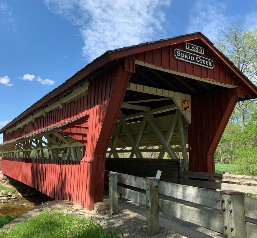 This quaint bridge is Union County's smallest covered bridge. In 2008 and 2016, the bridge was rehabilitated after large machinery tried to pass through the bridge and damaged the overhead braces. Spain Creek is designated as an exceptional warmwater and coldwater habitat by the Ohio Environmental Protection Agency.