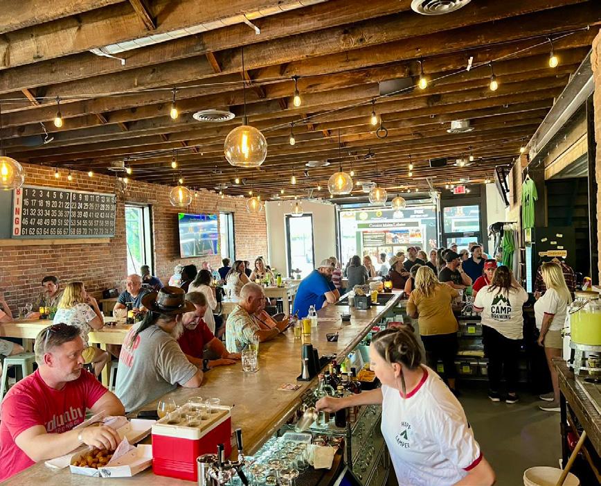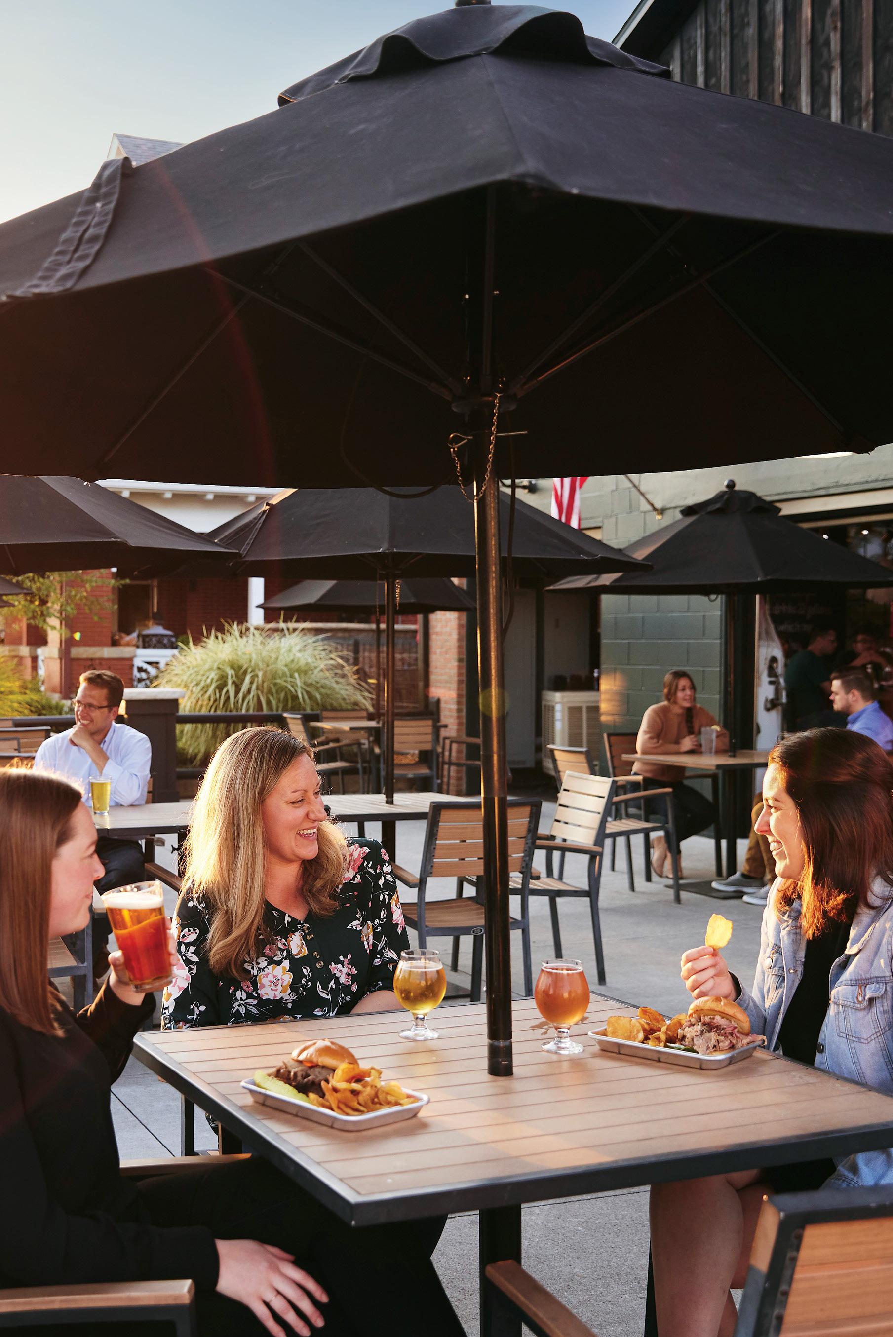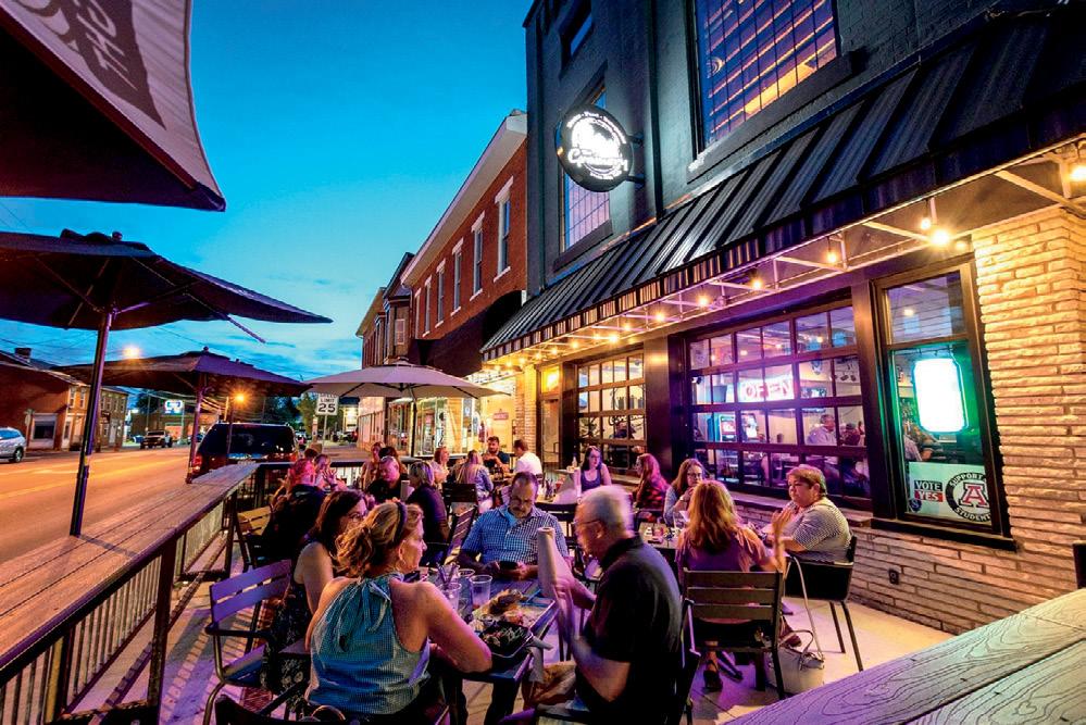 The Happenstance Brewing Project features 12 beers on taps that rotate along with a seltzer with plans to add more in the future. The building features garagestyle glass doors, spacious outdoor patio, and porch swings. Greenery and live edge bar tops and tables emphasize their motto, “beer, nature, and community.”