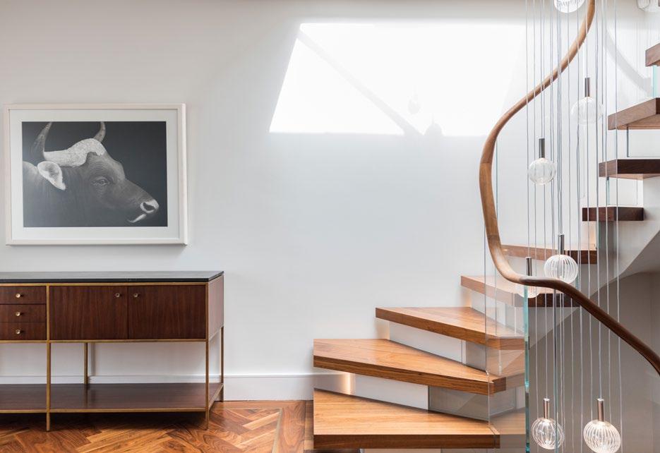 North Yorkshire. They are one of the top bespoke manufacturers in the world and made our 14 metre semi-cantilevered staircase from steel, glass and American black walnut, forming one gently curved, fluid sweep from top to bottom. The contemporary chandelier was designed to mirror the length and scale of the staircase and consists of 146 hand-etched glass spheres that complement the space and provide almost a sculptural element alongside the staircase.