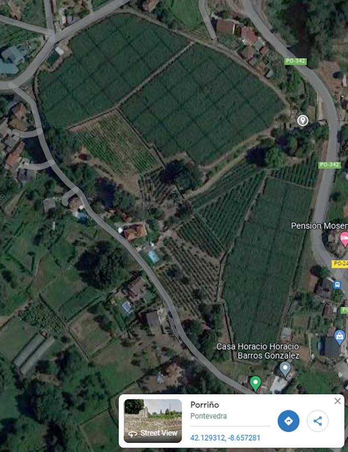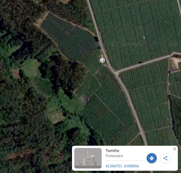 Las otras tres parcelas, –parcelas II, 42.129325, -8.657280; III, 42.018834, -8.665632; y IV, 42.004751, -8.698054–, de 4, 10 y 7 Ha, respectivamente, están situadas al sur de Pontevedra, en los municipios de Porriño y Tomiño, muy cerca del Miño. Pertenecen al segundo productor en volumen de la empresa y presentan unas características más diversas con parcelas dispuestas en terraza o en pendientes medias. El sistema de conducción también es en pérgola, pero ha sido reconvertida o está en proceso de reconversión desde el sistema de conducción T-bar. El manejo es intensivo y las densidades, medias. Estos son los métodos de cultuvo empleados con más detalle.