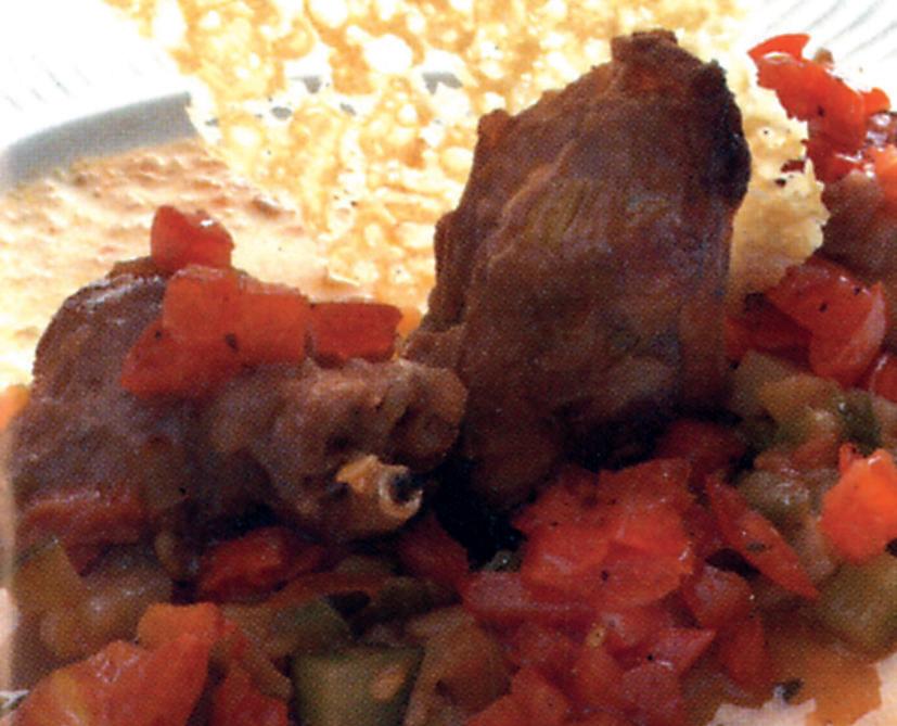 Trocear, salpimentar el conejo y dorarlo en una sartén con mantequilla; reservar. Mientras, en una cacerola pochar con mantequilla los dientes de ajo, la cebolla picada y el pimiento rojo troceado. Cuando la cebolla esté casi transparente, añadir la berenjena y el calabacín cortados en cubos; mezclar bien y añadir los tomates pelados y cortados, el concentrado de tomate y el aceite de oliva. Para servir, pasar la verdura por el pasapurés. Finalmente,